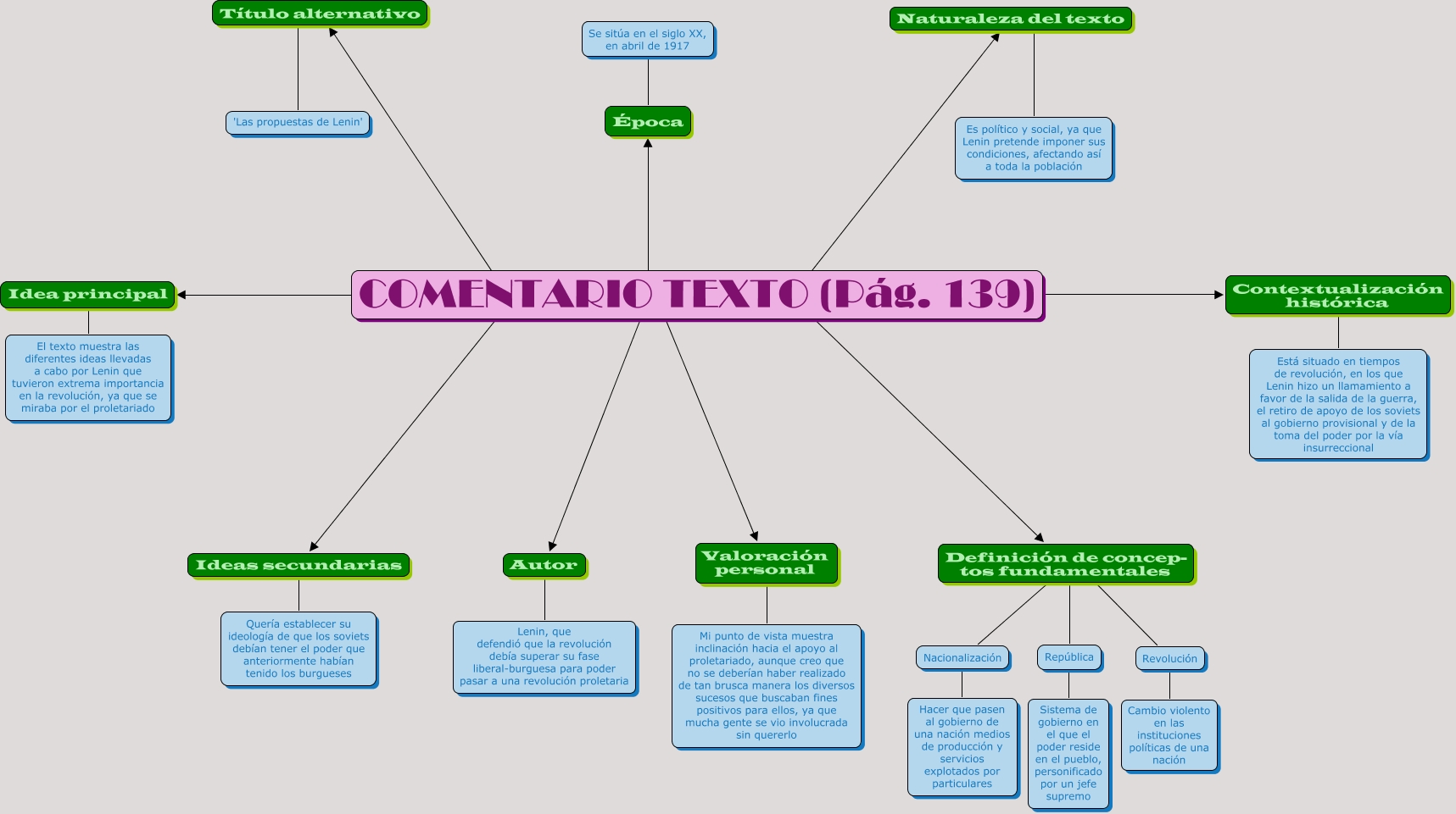 Este Cmap, tiene información relacionada con: TEMA 7 - comentario de texto pág. 139, COMENTARIO TEXTO (Pág. 139) ???? Época, Autor ???? Lenin, que defendió que la revolución debía superar su fase liberal-burguesa para poder pasar a una revolución proletaria, República ???? Sistema de gobierno en el que el poder reside en el pueblo, personificado por un jefe supremo, Nacionalización ???? Hacer que pasen al gobierno de una nación medios de producción y servicios explotados por particulares, Definición de concep- tos fundamentales ???? Revolución, Contextualización histórica ???? Está situado en tiempos de revolución, en los que Lenin hizo un llamamiento a favor de la salida de la guerra, el retiro de apoyo de los soviets al gobierno provisional y de la toma del poder por la vía insurreccional, Definición de concep- tos fundamentales ???? Nacionalización, COMENTARIO TEXTO (Pág. 139) ???? Contextualización histórica, Título alternativo ???? 'Las propuestas de Lenin', Idea principal ???? El texto muestra las diferentes ideas llevadas a cabo por Lenin que tuvieron extrema importancia en la revolución, ya que se miraba por el proletariado, COMENTARIO TEXTO (Pág. 139) ???? Idea principal, Ideas secundarias ???? Quería establecer su ideología de que los soviets debían tener el poder que anteriormente habían tenido los burgueses, Definición de concep- tos fundamentales ???? República, COMENTARIO TEXTO (Pág. 139) ???? Naturaleza del texto, Época ???? Se sitúa en el siglo XX, en abril de 1917, COMENTARIO TEXTO (Pág. 139) ???? Autor, COMENTARIO TEXTO (Pág. 139) ???? Valoración personal, Naturaleza del texto ???? Es político y social, ya que Lenin pretende imponer sus condiciones, afectando así a toda la población, COMENTARIO TEXTO (Pág. 139) ???? Definición de concep- tos fundamentales, Valoración personal ???? Mi punto de vista muestra inclinación hacia el apoyo al proletariado, aunque creo que no se deberían haber realizado de tan brusca manera los diversos sucesos que buscaban fines positivos para ellos, ya que mucha gente se vio involucrada sin quererlo