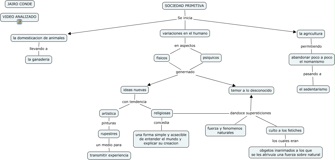 Este Cmap, tiene información relacionada con: JAIROCONDE, la agricultura permitiendo abandonar poco a poco el nomanismo, variaciones en el humano en aspectos fisicos, SOCIEDAD PRIMITIVA Se inicia la domesticacion de animales, culto a los fetiches los cuales eran obgetos inanimados a los que se les atrivuia una fuerza sobre natural, religiosas dandoce supersticiones temor a lo desconocido, psiquicos genernado temor a lo desconocido, ideas nuevas con tendencia religiosas, la domesticacion de animales llevando a la ganaderia, fisicos genernado temor a lo desconocido, variaciones en el humano en aspectos psiquicos, religiosas concedia una forma simple y acsecible de entender el mundo y explicar su creacion, rupestres un medio para transmitir experiencia, psiquicos genernado ideas nuevas, religiosas dandoce supersticiones culto a los fetiches, artistica pinturas rupestres, ideas nuevas con tendencia artistica, SOCIEDAD PRIMITIVA Se inicia variaciones en el humano, SOCIEDAD PRIMITIVA Se inicia la agricultura, fisicos genernado ideas nuevas, abandonar poco a poco el nomanismo pasando a el sedentarismo