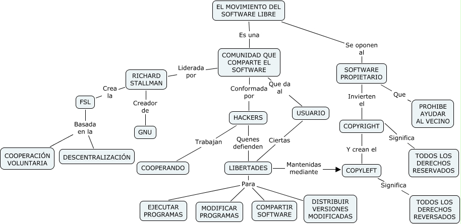 Este Cmap, tiene información relacionada con: Movimiento_software_libre, LIBERTADES Para MODIFICAR PROGRAMAS, FSL Basada en la DESCENTRALIZACIÓN, COPYRIGHT Y crean el COPYLEFT, EL MOVIMIENTO DEL SOFTWARE LIBRE Es una COMUNIDAD QUE COMPARTE EL SOFTWARE, FSL Basada en la COOPERACIÓN VOLUNTARIA, LIBERTADES Para COMPARTIR SOFTWARE, RICHARD STALLMAN Creador de GNU, COMUNIDAD QUE COMPARTE EL SOFTWARE Que da al USUARIO, LIBERTADES Para EJECUTAR PROGRAMAS, COPYRIGHT Significa TODOS LOS DERECHOS RESERVADOS, RICHARD STALLMAN Crea la FSL, COMUNIDAD QUE COMPARTE EL SOFTWARE Conformada por HACKERS, EL MOVIMIENTO DEL SOFTWARE LIBRE Se oponen al SOFTWARE PROPIETARIO, LIBERTADES Para DISTRIBUIR VERSIONES MODIFICADAS, USUARIO Ciertas LIBERTADES, LIBERTADES Mantenidas mediante COPYLEFT, HACKERS Quenes defienden LIBERTADES, SOFTWARE PROPIETARIO Que PROHIBE AYUDAR AL VECINO, SOFTWARE PROPIETARIO Invierten el COPYRIGHT, COPYLEFT Significa TODOS LOS DERECHOS REVERSADOS