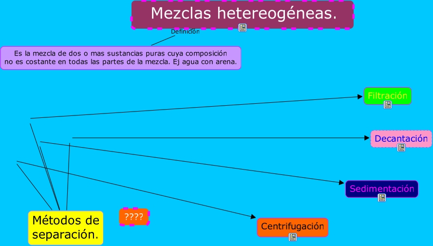 Este Cmap, tiene información relacionada con: Mezclas hetereogéneas, Mezclas hetereogéneas. Definición Es la mezcla de dos o mas sustancias puras cuya composición no es costante en todas las partes de la mezcla. Ej agua con arena., Métodos de separación. Centrifugación, Métodos de separación. Sedimentación, Métodos de separación. Decantación, Métodos de separación. Filtración