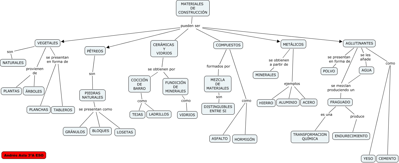 Este Cmap, tiene información relacionada con: materiales_construccion_andresasla, COMPUESTOS como ASFALTO, METÁLICOS ejemplos ACERO, MEZCLA DE MATERIALES son DISTINGUIBLES ENTRE SI, AGUA se mezclan produciendo un FRAGUADO, PIEDRAS NATURALES se presentan como BLOQUES, FUNDICIÓN DE MINERALES como VIDRIOS, VEGETALES son NATURALES, COMPUESTOS formados por MEZCLA DE MATERIALES, PÉTREOS son PIEDRAS NATURALES, VEGETALES se presentan en forma de PLANCHAS, VEGETALES provienen de ÁRBOLES, AGLUTINANTES se presentan en forma de POLVO, VEGETALES provienen de PLANTAS, AGLUTINANTES como CEMENTO, COMPUESTOS como HORMIGÓN, METÁLICOS ejemplos ALUMINIO, METÁLICOS ejemplos HIERRO, CERÁMICAS Y VIDRIOS se obtienen por FUNDICIÓN DE MINERALES, PIEDRAS NATURALES se presentan como LOSETAS, VEGETALES se presentan en forma de TABLEROS