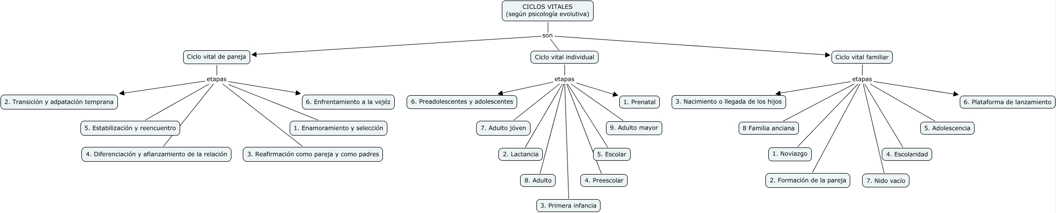Este Cmap, tiene información relacionada con: Ciclos vitales, Ciclo vital individual etapas 6. Preadolescentes y adolescentes, Ciclo vital individual etapas 3. Primera infancia, Ciclo vital familiar etapas 2. Formación de la pareja, Ciclo vital familiar etapas 1. Noviazgo, Ciclo vital individual etapas 9. Adulto mayor, CICLOS VITALES (según psicología evolutiva) son Ciclo vital familiar, Ciclo vital familiar etapas 3. Nacimiento o llegada de los hijos, Ciclo vital de pareja etapas 3. Reafirmación como pareja y como padres, Ciclo vital familiar etapas 4. Escolaridad, Ciclo vital individual etapas 8. Adulto, Ciclo vital de pareja etapas 2. Transición y adpatación temprana, Ciclo vital familiar etapas 8 Familia anciana, Ciclo vital de pareja etapas 6. Enfrentamiento a la vejéz, CICLOS VITALES (según psicología evolutiva) son Ciclo vital individual, Ciclo vital de pareja etapas 4. Diferenciación y afianzamiento de la relación, Ciclo vital familiar etapas 5. Adolescencia, Ciclo vital individual etapas 5. Escolar, CICLOS VITALES (según psicología evolutiva) son Ciclo vital de pareja, Ciclo vital familiar etapas 7. Nido vacío, Ciclo vital individual etapas 7. Adulto jóven