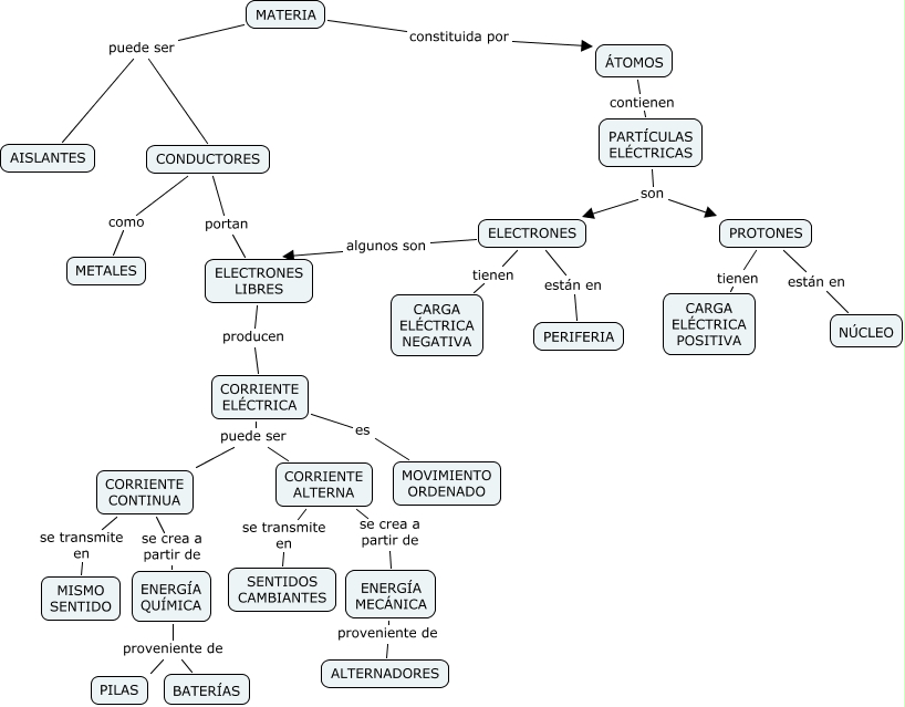 Este Cmap, tiene información relacionada con: Cristina Rodilla-Electricidad, ELECTRONES tienen CARGA ELÉCTRICA NEGATIVA, CORRIENTE ALTERNA se crea a partir de ENERGÍA MECÁNICA, CORRIENTE ELÉCTRICA puede ser CORRIENTE ALTERNA, MATERIA puede ser CONDUCTORES, PARTÍCULAS ELÉCTRICAS son ELECTRONES, CORRIENTE ALTERNA se transmite en SENTIDOS CAMBIANTES, CORRIENTE CONTINUA se crea a partir de ENERGÍA QUÍMICA, CORRIENTE CONTINUA se transmite en MISMO SENTIDO, MATERIA constituida por ÁTOMOS, CORRIENTE ELÉCTRICA puede ser CORRIENTE CONTINUA, ELECTRONES LIBRES producen CORRIENTE ELÉCTRICA, PROTONES tienen CARGA ELÉCTRICA POSITIVA, ENERGÍA MECÁNICA proveniente de ALTERNADORES, ENERGÍA QUÍMICA proveniente de PILAS, CORRIENTE ELÉCTRICA es MOVIMIENTO ORDENADO, CONDUCTORES portan ELECTRONES LIBRES, ELECTRONES algunos son ELECTRONES LIBRES, CONDUCTORES como METALES, ÁTOMOS contienen PARTÍCULAS ELÉCTRICAS, ELECTRONES están en PERIFERIA