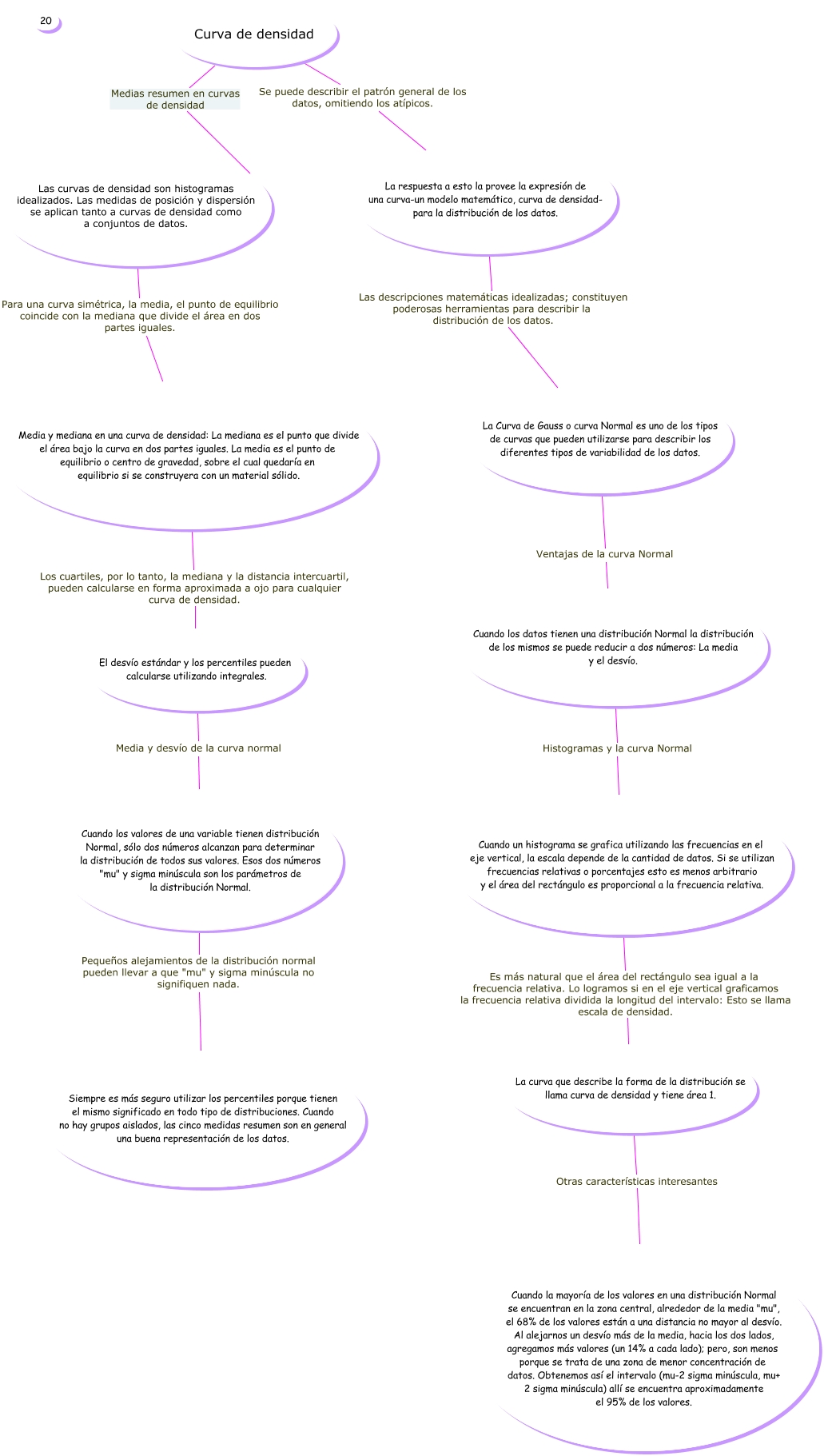 Este Cmap, tiene información relacionada con: MAPA CONCEPTUAL control estrategico, El desvío estándar y los percentiles pueden calcularse utilizando integrales. Media y desvío de la curva normal Cuando los valores de una variable tienen distribución Normal, sólo dos números alcanzan para determinar la distribución de todos sus valores. Esos dos números "mu" y sigma minúscula son los parámetros de la distribución Normal., Cuando los valores de una variable tienen distribución Normal, sólo dos números alcanzan para determinar la distribución de todos sus valores. Esos dos números "mu" y sigma minúscula son los parámetros de la distribución Normal. Pequeños alejamientos de la distribución normal pueden llevar a que "mu" y sigma minúscula no signifiquen nada. Siempre es más seguro utilizar los percentiles porque tienen el mismo significado en todo tipo de distribuciones. Cuando no hay grupos aislados, las cinco medidas resumen son en general una buena representación de los datos., Cuando un histograma se grafica utilizando las frecuencias en el eje vertical, la escala depende de la cantidad de datos. Si se utilizan frecuencias relativas o porcentajes esto es menos arbitrario y el área del rectángulo es proporcional a la frecuencia relativa. Es más natural que el área del rectángulo sea igual a la frecuencia relativa. Lo logramos si en el eje vertical graficamos la frecuencia relativa dividida la longitud del intervalo: Esto se llama escala de densidad. La curva que describe la forma de la distribución se llama curva de densidad y tiene área 1., La curva que describe la forma de la distribución se llama curva de densidad y tiene área 1. Otras características interesantes Cuando la mayoría de los valores en una distribución Normal se encuentran en la zona central, alrededor de la media "mu", el 68% de los valores están a una distancia no mayor al desvío. Al alejarnos un desvío más de la media, hacia los dos lados, agregamos más valores (un 14% a cada lado); pero, son menos porque se trata de una zona de menor concentración de datos. Obtenemos así el intervalo (mu-2 sigma minúscula, mu+ 2 sigma minúscula) allí se encuentra aproximadamente el 95% de los valores., Cuando los datos tienen una distribución Normal la distribución de los mismos se puede reducir a dos números: La media y el desvío. Histogramas y la curva Normal Cuando un histograma se grafica utilizando las frecuencias en el eje vertical, la escala depende de la cantidad de datos. Si se utilizan frecuencias relativas o porcentajes esto es menos arbitrario y el área del rectángulo es proporcional a la frecuencia relativa., Curva de densidad Se puede describir el patrón general de los datos, omitiendo los atípicos. La respuesta a esto la provee la expresión de una curva-un modelo matemático, curva de densidad- para la distribución de los datos., La Curva de Gauss o curva Normal es uno de los tipos de curvas que pueden utilizarse para describir los diferentes tipos de variabilidad de los datos. Ventajas de la curva Normal Cuando los datos tienen una distribución Normal la distribución de los mismos se puede reducir a dos números: La media y el desvío., Las curvas de densidad son histogramas idealizados. Las medidas de posición y dispersión se aplican tanto a curvas de densidad como a conjuntos de datos. Para una curva simétrica, la media, el punto de equilibrio coincide con la mediana que divide el área en dos partes iguales. Media y mediana en una curva de densidad: La mediana es el punto que divide el área bajo la curva en dos partes iguales. La media es el punto de equilibrio o centro de gravedad, sobre el cual quedaría en equilibrio si se construyera con un material sólido., Curva de densidad Medias resumen en curvas de densidad Las curvas de densidad son histogramas idealizados. Las medidas de posición y dispersión se aplican tanto a curvas de densidad como a conjuntos de datos., Media y mediana en una curva de densidad: La mediana es el punto que divide el área bajo la curva en dos partes iguales. La media es el punto de equilibrio o centro de gravedad, sobre el cual quedaría en equilibrio si se construyera con un material sólido. Los cuartiles, por lo tanto, la mediana y la distancia intercuartil, pueden calcularse en forma aproximada a ojo para cualquier curva de densidad. El desvío estándar y los percentiles pueden calcularse utilizando integrales., La respuesta a esto la provee la expresión de una curva-un modelo matemático, curva de densidad- para la distribución de los datos. Las descripciones matemáticas idealizadas; constituyen poderosas herramientas para describir la distribución de los datos. La Curva de Gauss o curva Normal es uno de los tipos de curvas que pueden utilizarse para describir los diferentes tipos de variabilidad de los datos.