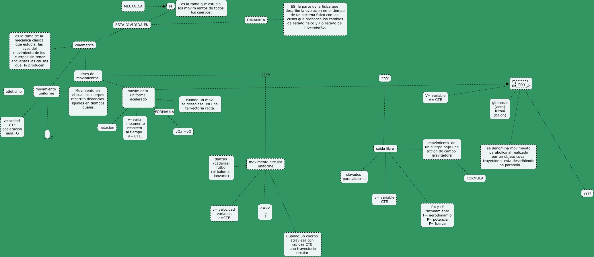 Este Cmap, tiene información relacionada con: FABER, movimiento uniforme acelerado ???? natacion, caida libre ???? F= p+f razonamiento F= aerodimamio P= potencia F= fuerza, DINAMICA ???? ES la parte de la física que describe la evolucion en el tiempo de un sistema fisico con las cusas que probocan los cambios de estado fisico y / o estado de movimiento., clses de movimientos moviento parabolico, ESTA DIVIDIDA EN ???? DINAMICA, movimiento uniforme ????, movimiento de un cuerpo bajo una accion de campo gravitadora ???? FORMULA, movimento circular uniforme ???? a=V2 _ f, moviento parabolico ???? V= variable A= CTE, caida libre cla clavados paracaidismo, clses de movimientos movimiento uniforme acelerado, caida libre ???? v= variable CTE, movimento circular uniforme ???? danzas (caderas) futbol (el balon al lanzarlo), movimiento uniforme acelerado ???? v=varia lineamente respecto al tiempo . a= CTE., movimento circular uniforme ???? v= velocidad variable. a=CTE, ???? ???? caida libre, moviento parabolico ???? ????, movimento circular uniforme ???? Cuando un cuerpo atravieza con rapidez CTE una trayectoria circular., MECANICA ???? es, moviento parabolico gimnasia (arco) futbol (balon)
