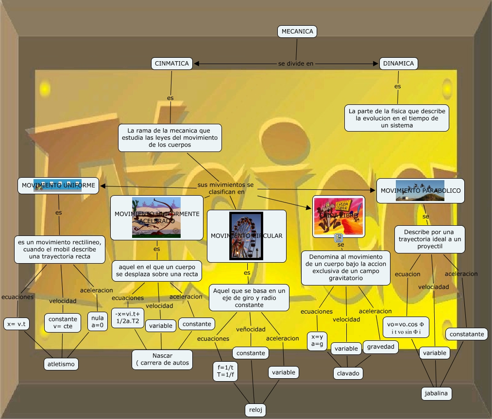 Este Cmap, tiene información relacionada con: yesisito ospina, MOVIMIENTO UNIFORME es es un movimiento rectilineo, cuando el mobil describe una trayectoria recta, MOVIMIENTO PARABOLICO se Describe por una trayectoria ideal a un proyectil, DINAMICA es La parte de la fisica que describe la evolucion en el tiempo de un sistema, MECANICA se divide en CINMATICA, constante ???? reloj, aquel en el que un cuerpo se desplaza sobre una recta velocidad variable, La rama de la mecanica que estudia las leyes del movimiento de los cuerpos sus mivimientos se clasifican en MOVIMIENTO UNIFORMENTE ACELERADO, es un movimiento rectilineo, cuando el mobil describe una trayectoria recta aceleracion nula a=0, La rama de la mecanica que estudia las leyes del movimiento de los cuerpos sus mivimientos se clasifican en MOVIMIENTO CIRCULAR, variable ???? clavado, Describe por una trayectoria ideal a un proyectil velociadad variable, Aquel que se basa en un eje de giro y radio constante aceleracion variable, es un movimiento rectilineo, cuando el mobil describe una trayectoria recta velocidad constante v= cte, Denomina al movimiento de un cuerpo bajo la accion exclusiva de un campo gravitatorio velocidad variable, variable ???? Nascar ( carrera de autos, constante v= cte ???? atletismo, CINMATICA es La rama de la mecanica que estudia las leyes del movimiento de los cuerpos, La rama de la mecanica que estudia las leyes del movimiento de los cuerpos sus mivimientos se clasifican en MOVIMIENTO UNIFORME, MECANICA se divide en DINAMICA, Describe por una trayectoria ideal a un proyectil aceleracion constatante