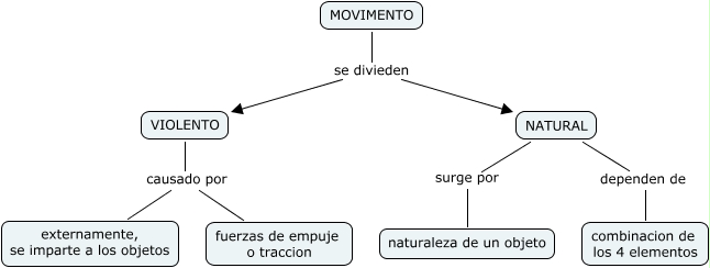 Bejar, VIOLENTO causado por externamente, se imparte a los objetos, MOVIMENTO se divieden NATURAL, VIOLENTO causado por fuerzas de empuje o traccion, MOVIMENTO se divieden VIOLENTO, NATURAL surge por naturaleza de un objeto, NATURAL dependen de combinacion de los 4 elementos