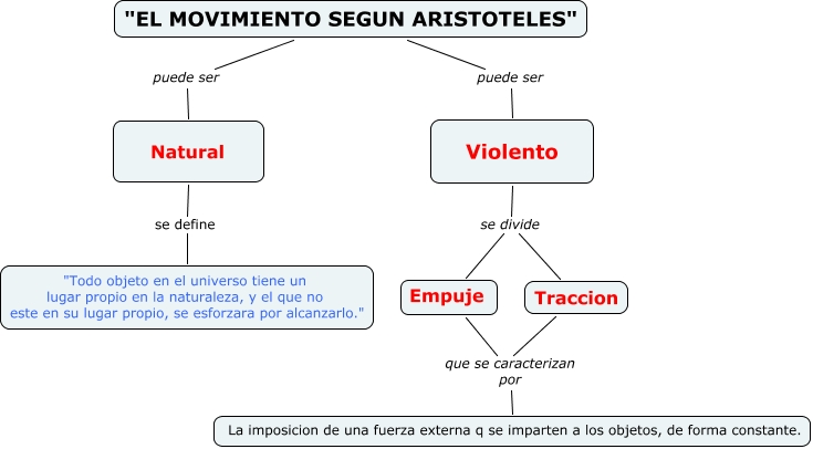 Albea, "EL MOVIMIENTO SEGUN ARISTOTELES" puede ser Violento, Violento se divide Traccion, Violento se divide Empuje, Empuje que se caracterizan por La imposicion de una fuerza externa q se imparten a los objetos, de forma constante., Natural se define "Todo objeto en el universo tiene un lugar propio en la naturaleza, y el que no este en su lugar propio, se esforzara por alcanzarlo.", "EL MOVIMIENTO SEGUN ARISTOTELES" puede ser Natural, Traccion que se caracterizan por La imposicion de una fuerza externa q se imparten a los objetos, de forma constante.