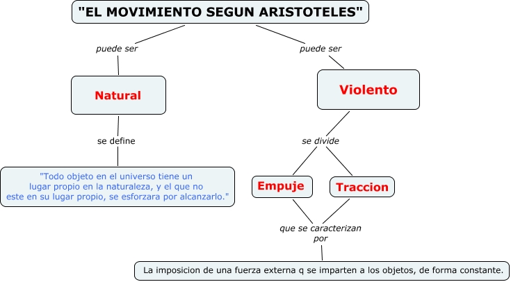 castellon daniel-MOV. SEGUN ARISTOTELES, Violento se divide Traccion, "EL MOVIMIENTO SEGUN ARISTOTELES" puede ser Violento, Natural se define "Todo objeto en el universo tiene un lugar propio en la naturaleza, y el que no este en su lugar propio, se esforzara por alcanzarlo.", Empuje que se caracterizan por La imposicion de una fuerza externa q se imparten a los objetos, de forma constante., Violento se divide Empuje, Traccion que se caracterizan por La imposicion de una fuerza externa q se imparten a los objetos, de forma constante., "EL MOVIMIENTO SEGUN ARISTOTELES" puede ser Natural
