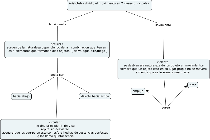 galleguillo , maldonado; horvath, Aristoteles dividio el movimiento en 2 clases principales Movimiento natural : surgen de la naturalesa dependiendo de la combinacion que tenian los 4 elementos que formaban alos objetos ( tierra,agua,aire,fuego ), natural : surgen de la naturalesa dependiendo de la combinacion que tenian los 4 elementos que formaban alos objetos ( tierra,agua,aire,fuego ) podia ser: hacia abajo, violento : se desbian ala naturaleza de los objeto en movimientos siempre que un objeto esta en su lugar propio no se movera almenos que se le someta una fuerza surge empuje, Aristoteles dividio el movimiento en 2 clases principales Movimiento violento : se desbian ala naturaleza de los objeto en movimientos siempre que un objeto esta en su lugar propio no se movera almenos que se le someta una fuerza, natural : surgen de la naturalesa dependiendo de la combinacion que tenian los 4 elementos que formaban alos objetos ( tierra,agua,aire,fuego ) podia ser: circular : no tine prinsipio ni fin y se repite sin desviarse asegura que los cuerpo celeste son esfera hechas de sustancias perfectas q las llamo quintaesencia, natural : surgen de la naturalesa dependiendo de la combinacion que tenian los 4 elementos que formaban alos objetos ( tierra,agua,aire,fuego ) podia ser: directo hacia arriba, violento : se desbian ala naturaleza de los objeto en movimientos siempre que un objeto esta en su lugar propio no se movera almenos que se le someta una fuerza surge tiron