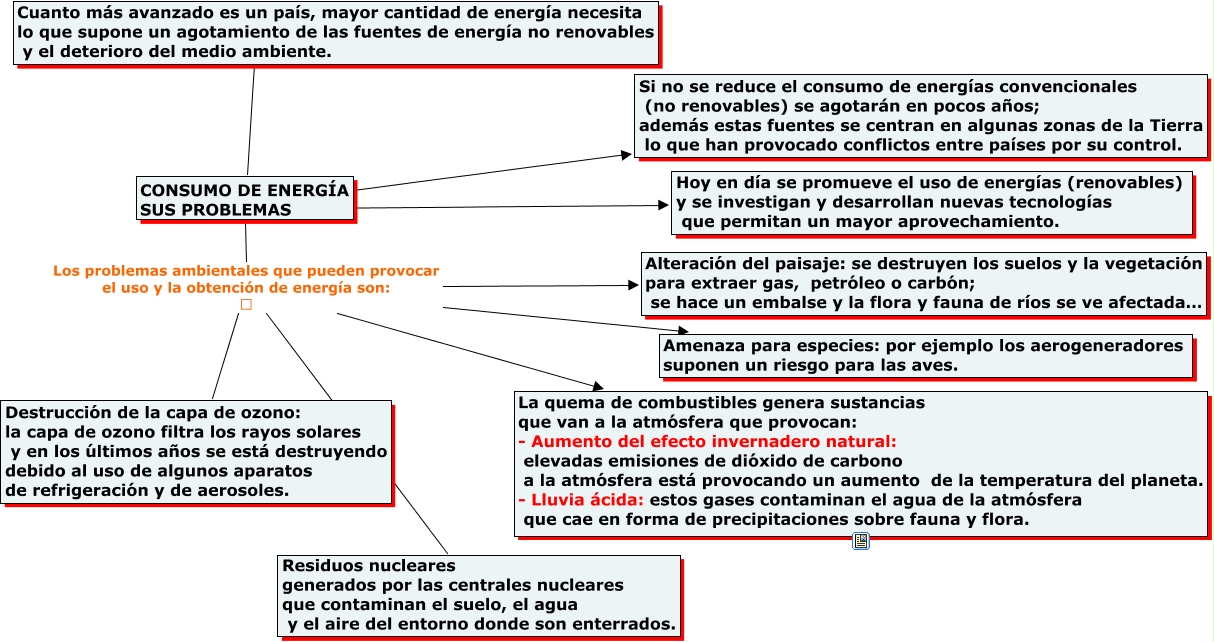 Este Cmap, tiene información relacionada con: CONSUMO DE ENERGÍA SUS PROBLEMAS, CONSUMO DE ENERGÍA SUS PROBLEMAS Los problemas ambientales que pueden provocar el uso y la obtención de energía son: Amenaza para especies: por ejemplo los aerogeneradores suponen un riesgo para las aves., CONSUMO DE ENERGÍA SUS PROBLEMAS Los problemas ambientales que pueden provocar el uso y la obtención de energía son: La quema de combustibles genera sustancias que van a la atmósfera que provocan: - Aumento del efecto invernadero natural: elevadas emisiones de dióxido de carbono a la atmósfera está provocando un aumento de la temperatura del planeta. - Lluvia ácida: estos gases contaminan el agua de la atmósfera que cae en forma de precipitaciones sobre fauna y flora., CONSUMO DE ENERGÍA SUS PROBLEMAS ???? Si no se reduce el consumo de energías convencionales (no renovables) se agotarán en pocos años; además estas fuentes se centran en algunas zonas de la Tierra lo que han provocado conflictos entre países por su control., CONSUMO DE ENERGÍA SUS PROBLEMAS ???? Hoy en día se promueve el uso de energías (renovables) y se investigan y desarrollan nuevas tecnologías que permitan un mayor aprovechamiento., CONSUMO DE ENERGÍA SUS PROBLEMAS Los problemas ambientales que pueden provocar el uso y la obtención de energía son: Destrucción de la capa de ozono: la capa de ozono filtra los rayos solares y en los últimos años se está destruyendo debido al uso de algunos aparatos de refrigeración y de aerosoles., CONSUMO DE ENERGÍA SUS PROBLEMAS Los problemas ambientales que pueden provocar el uso y la obtención de energía son: Residuos nucleares generados por las centrales nucleares que contaminan el suelo, el agua y el aire del entorno donde son enterrados., CONSUMO DE ENERGÍA SUS PROBLEMAS Los problemas ambientales que pueden provocar el uso y la obtención de energía son: Alteración del paisaje: se destruyen los suelos y la vegetación para extraer gas, petróleo o carbón; se hace un embalse y la flora y fauna de ríos se ve afectada…, CONSUMO DE ENERGÍA SUS PROBLEMAS ???? Cuanto más avanzado es un país, mayor cantidad de energía necesita lo que supone un agotamiento de las fuentes de energía no renovables y el deterioro del medio ambiente.