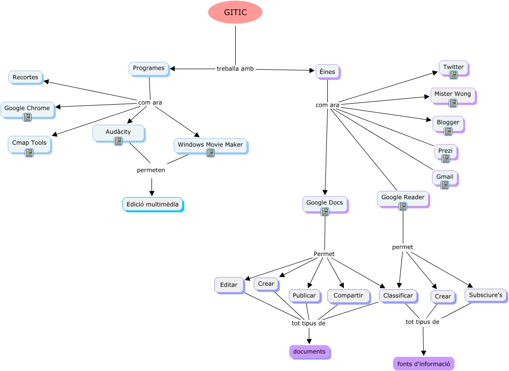 Este Cmap, tiene información relacionada con: m.conceptual, Google Docs Permet Compartir, Programes com ara Audàcity, Programes com ara Recortes, GITIC treballa amb Programes, Èines com ara Google Reader, Èines com ara Prezi, Èines com ara Gmail, Google Reader permet Classificar, Subsciure's tot tipus de fonts d'informació, Crear tot tipus de documents, GITIC treballa amb Èines, Crear tot tipus de fonts d'informació, Editar tot tipus de documents, Compartir tot tipus de documents, Èines com ara Google Docs, Classificar tot tipus de fonts d'informació, Publicar tot tipus de documents, Classificar tot tipus de documents, Èines com ara Twitter, Google Reader permet Subsciure's