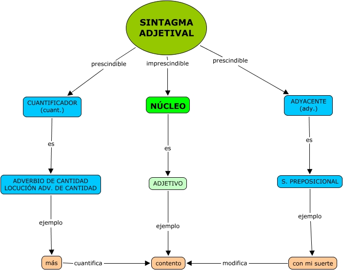 Este Cmap, tiene información relacionada con: sintagma adjetival, S. PREPOSICIONAL ejemplo con mi suerte, ADJETIVO ejemplo contento, SINTAGMA ADJETIVAL imprescindible NÚCLEO, SINTAGMA ADJETIVAL prescindible CUANTIFICADOR (cuant.), con mi suerte modifica contento, CUANTIFICADOR (cuant.) es ADVERBIO DE CANTIDAD LOCUCIÓN ADV. DE CANTIDAD, NÚCLEO es ADJETIVO, ADYACENTE (ady.) es S. PREPOSICIONAL, más cuantifica contento, ADVERBIO DE CANTIDAD LOCUCIÓN ADV. DE CANTIDAD ejemplo más, SINTAGMA ADJETIVAL prescindible ADYACENTE (ady.)