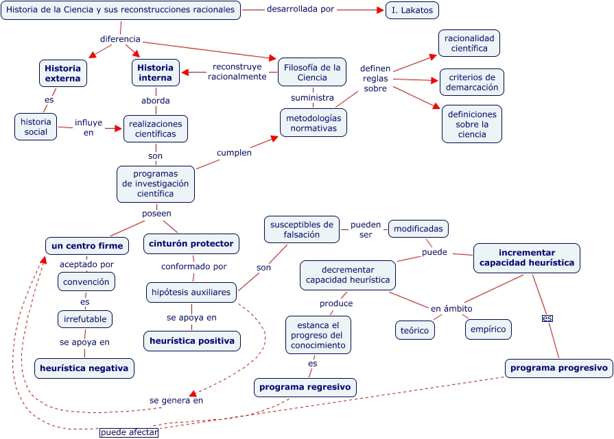 Este Cmap, tiene información relacionada con: lakatos, historia social influye en realizaciones científicas, Historia de la Ciencia y sus reconstrucciones racionales desarrollada por I. Lakatos, Historia de la Ciencia y sus reconstrucciones racionales diferencia Filosofía de la Ciencia, Historia de la Ciencia y sus reconstrucciones racionales diferencia Historia externa, programas de investigación científica cumplen metodologías normativas, Filosofía de la Ciencia reconstruye racionalmente Historia interna, irrefutable se apoya en heurística negativa, Historia interna aborda realizaciones científicas, incrementar capacidad heurística es programa progresivo, modificadas puede incrementar capacidad heurística, programa regresivo es estanca el progreso del conocimiento, programa progresivo puede afectar un centro firme, estanca el progreso del conocimiento produce decrementar capacidad heurística, hipótesis auxiliares se genera en un centro firme, cinturón protector conformado por hipótesis auxiliares, decrementar capacidad heurística en ámbito empírico, incrementar capacidad heurística en ámbito empírico, metodologías normativas definen reglas sobre definiciones sobre la ciencia, incrementar capacidad heurística en ámbito teórico, convención es irrefutable