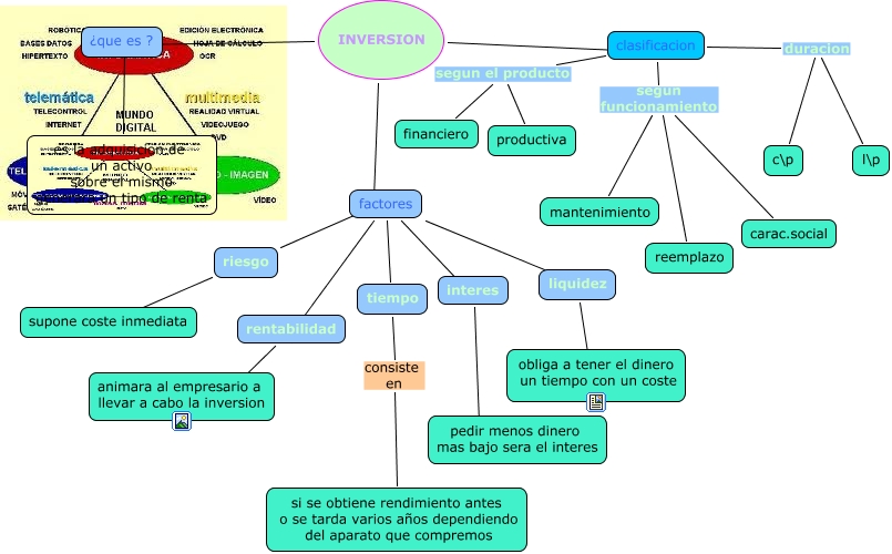 Este Cmap, tiene información relacionada con: economia !!!, clasificacion duracion l\p, INVERSION ???? ¿que es ?, ¿que es ? ???? es la adquisicion de un activo sobre el mismo generara un tipo de renta, clasificacion segun funcionamiento carac.social, clasificacion segun el producto financiero, riesgo ???? supone coste inmediata, factores ???? interes, interes ???? pedir menos dinero mas bajo sera el interes, clasificacion duracion c\p, liquidez ???? obliga a tener el dinero un tiempo con un coste, clasificacion segun funcionamiento mantenimiento, factores ???? tiempo, clasificacion segun el producto productiva, INVERSION ???? riesgo, tiempo consiste en si se obtiene rendimiento antes o se tarda varios años dependiendo del aparato que compremos, factores ???? rentabilidad, factores ???? liquidez, rentabilidad ???? animara al empresario a llevar a cabo la inversion, clasificacion segun funcionamiento reemplazo, INVERSION ???? clasificacion