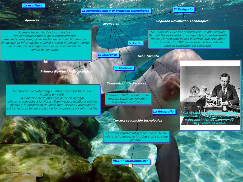 mikitah rodriguez lulitah de carli florcita gonzales de 4to A!!!, La comunicaciòn y el progreso tecnològico avanzo en La escritura, La imprenta avanzo en La escritura, La fotografía Tercera revolución tecnológica http://cmap.ihmc.us/, La comunicaciòn y el progreso tecnològico avanzo en La fotografía, La imprenta Primera Revolución Tecnológica Su creador fue Gutenberg su obra más importante fue la biblia en 1498. La evolución de la imprenta permitió agregar colores e imágenes a los libros. Este medio permitió la edición masiva y la producción de libros manuscritos y artesanales así los lectores tenían acceso de forma privada ala información., La fotografía Tercera revolución tecnológica El primer registro fotográfico fue en 1826 y duro ocho horas, la foto fue a un corral de ganado., La comunicaciòn y el progreso tecnològico avanzo en la Radio, El Teléfono Transmicion de Palabras Creado en 1876, era el primer aparato capaz de transmitir la palabra a distancia., La escritura Aparecío Aparece hace más de cinco mil años, fue el descucbrimiento de la representación mediante imágenes; la necesidad de reforzar la memoria almacenando información, el dificil proceso de ensayo y error para adaptar la imàgenes en la representación del sonido del lenguaje., La imprenta avanzo en La fotografía