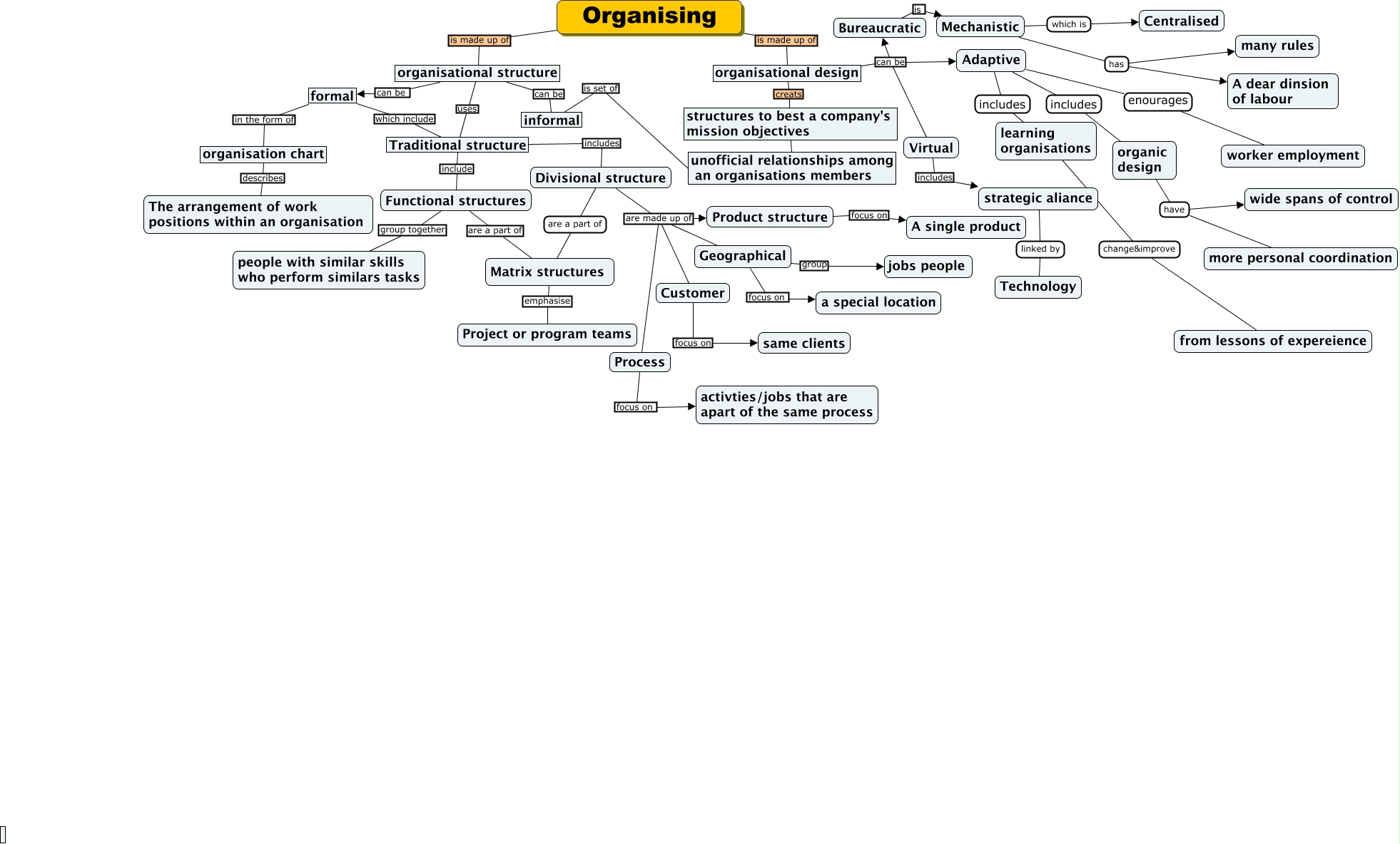 Este Cmap, tiene información relacionada con: ATENCION FARMACEUTICA, organic design have more personal coordination, Functional structures are a part of Matrix structures, formal in the form of organisation chart, Matrix structures emphasise Project or program teams, strategic aliance linked by Technology, organic design have wide spans of control, organisational structure can be informal, Adaptive includes learning organisations, organisational structure can be formal, formal which include Traditional structure, Mechanistic has A dear dinsion of labour, Organising is made up of organisational design, learning organisations change&improve from lessons of expereience, Process focus on activties/jobs that are apart of the same process, Product structure focus on A single product, Geographical group jobs people, structures to best a company's mission objectives ???? unofficial relationships among an organisations members, Virtual includes strategic aliance, Traditional structure includes Divisional structure, Bureaucratic is Mechanistic
