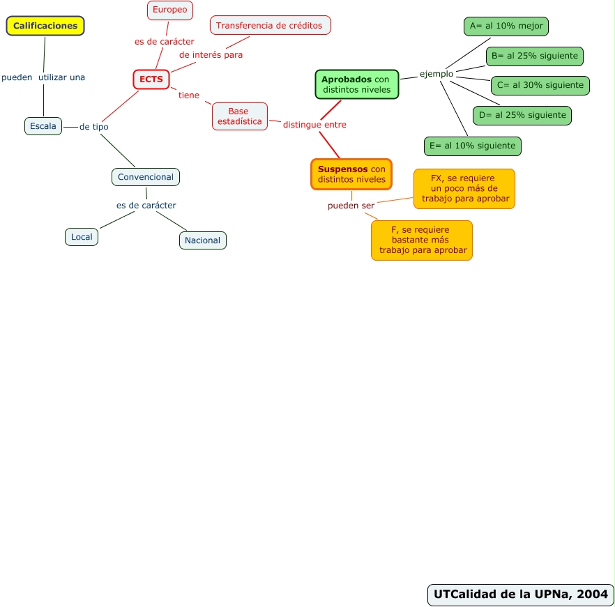 Este Cmap, tiene información relacionada con: Calificaciones, Aprobados con distintos niveles ejemplo D= al 25% siguiente, Aprobados con distintos niveles ejemplo B= al 25% siguiente, Base estadística distingue entre Aprobados con distintos niveles, ECTS de interés para Transferencia de créditos, Aprobados con distintos niveles ejemplo A= al 10% mejor, Escala de tipo Convencional, Suspensos con distintos niveles pueden ser F, se requiere bastante más trabajo para aprobar, Convencional es de carácter Nacional, Suspensos con distintos niveles pueden ser FX, se requiere un poco más de trabajo para aprobar, ECTS tiene Base estadística, ECTS es de carácter Europeo, Base estadística distingue entre Suspensos con distintos niveles, Aprobados con distintos niveles ejemplo C= al 30% siguiente, Escala de tipo ECTS, Convencional es de carácter Local, Aprobados con distintos niveles ejemplo E= al 10% siguiente, Calificaciones pueden utilizar una Escala