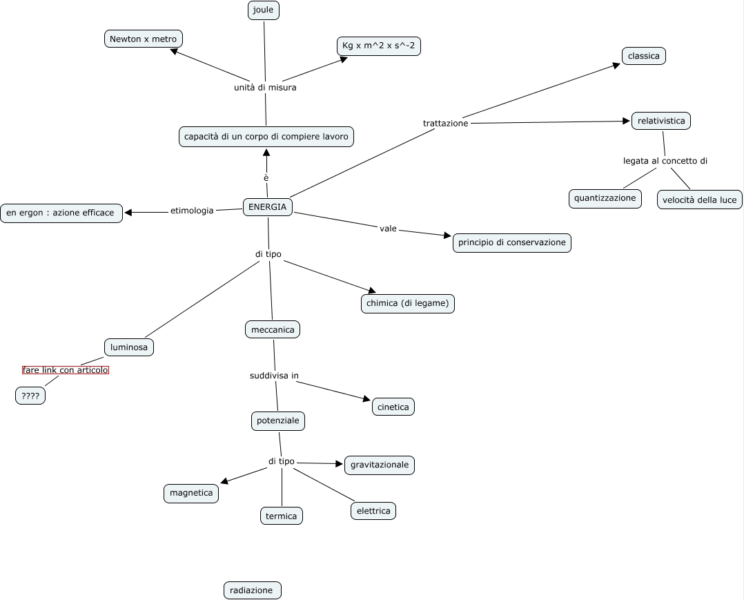Questa Cmap, creata con IHMC CmapTools, contiene informazioni relative a: energia, ENERGIA etimologia en ergon : azione efficace, ENERGIA è capacità di un corpo di compiere lavoro, luminosa fare link con articolo ????, potenziale di tipo elettrica, ENERGIA di tipo luminosa, joule unità di misura Kg x m^2 x s^-2, ENERGIA di tipo chimica (di legame), ENERGIA vale principio di conservazione, potenziale di tipo magnetica, relativistica legata al concetto di velocità della luce, capacità di un corpo di compiere lavoro unità di misura Newton x metro, joule unità di misura Newton x metro, potenziale di tipo gravitazionale, relativistica legata al concetto di quantizzazione, ENERGIA trattazione classica, capacità di un corpo di compiere lavoro unità di misura Kg x m^2 x s^-2, meccanica suddivisa in potenziale, meccanica suddivisa in cinetica, potenziale di tipo termica, ENERGIA trattazione relativistica