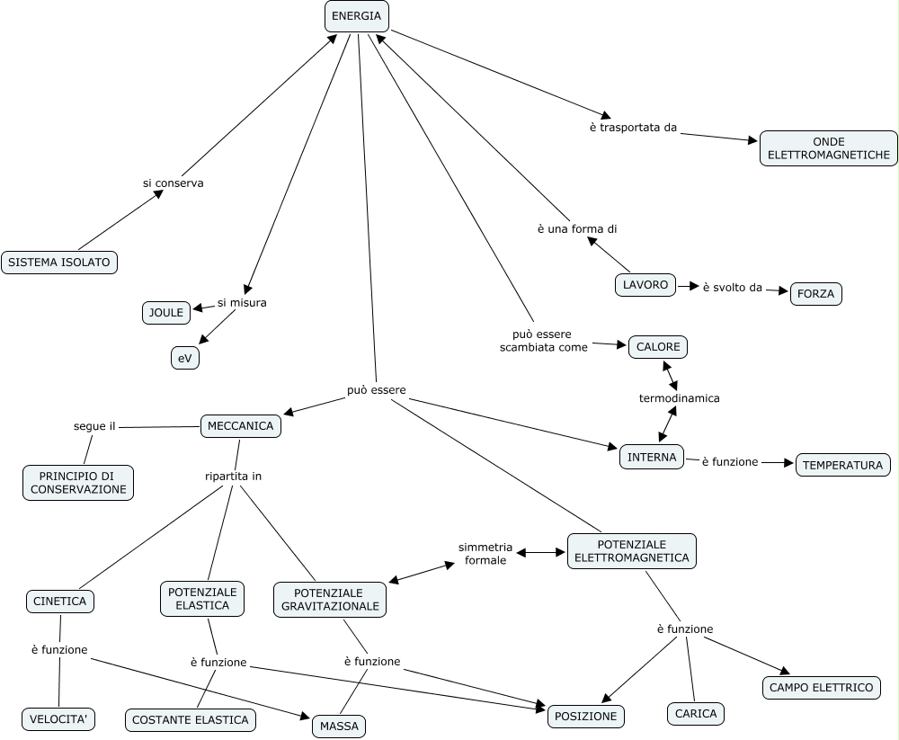 Questa Cmap, creata con IHMC CmapTools, contiene informazioni relative a: energia, POTENZIALE ELETTROMAGNETICA è funzione POSIZIONE, INTERNA è funzione TEMPERATURA, ENERGIA si misura JOULE, CINETICA è funzione VELOCITA', MECCANICA ripartita in POTENZIALE GRAVITAZIONALE, LAVORO è una forma di ENERGIA, ENERGIA è trasportata da ONDE ELETTROMAGNETICHE, MECCANICA segue il PRINCIPIO DI CONSERVAZIONE, INTERNA termodinamica CALORE, POTENZIALE GRAVITAZIONALE è funzione MASSA, POTENZIALE ELASTICA è funzione COSTANTE ELASTICA, ENERGIA può essere INTERNA, POTENZIALE ELETTROMAGNETICA è funzione CARICA, ENERGIA si misura eV, POTENZIALE GRAVITAZIONALE simmetria formale POTENZIALE ELETTROMAGNETICA, ENERGIA può essere POTENZIALE ELETTROMAGNETICA, SISTEMA ISOLATO si conserva ENERGIA, ENERGIA può essere scambiata come CALORE, CINETICA è funzione MASSA, ENERGIA può essere MECCANICA