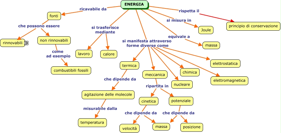 Questa Cmap, creata con IHMC CmapTools, contiene informazioni relative a: energia, ENERGIA si manifesta attraverso forme diverse come nucleare, rinnovabili come ad esempio idroelettrica, ENERGIA ricavabile da fonti, meccanica ripartita in cinetica, ENERGIA si manifesta attraverso forme diverse come termica, non rinnovabili come ad esempio combustibili fossili, fonti che possono essere non rinnovabili, cinetica che dipende da velocità, ENERGIA si manifesta attraverso forme diverse come chimica, ENERGIA si manifesta attraverso forme diverse come elettrostatica, ENERGIA si misura in Joule, rinnovabili come ad esempio solare, ENERGIA si manifesta attraverso forme diverse come elettromagnetica, potenziale che dipende da posizione, cinetica che dipende da massa, ENERGIA rispetta il principio di conservazione, ENERGIA equivale a massa, meccanica ripartita in potenziale, rinnovabili come ad esempio delle maree, ENERGIA si trasferisce mediante calore