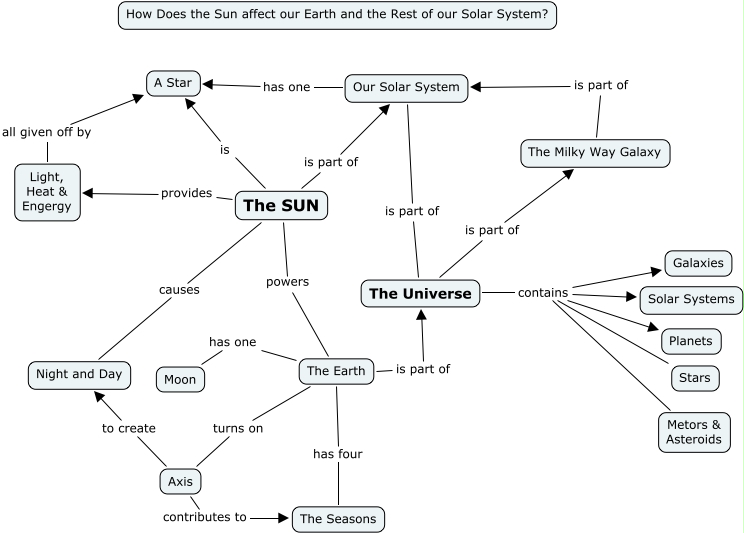 This Concept Map, created with IHMC CmapTools, has information related to: The Sun C-Map, The Earth has four The Seasons, The Universe contains Stars, Our Solar System is part of The Universe, Our Solar System has one A Star, The Earth turns on Axis, Axis contributes to The Seasons, The Earth is part of The Universe, The Earth has one Moon, The Universe is part of The Milky Way Galaxy, The SUN is A Star, The SUN is part of Our Solar System, The Universe contains Planets, Light, Heat & Engergy all given off by A Star, Axis to create Night and Day, The Universe contains Metors & Asteroids, The SUN provides Light, Heat & Engergy, The Universe contains Solar Systems, The Milky Way Galaxy is part of Our Solar System, The SUN powers The Earth, The Universe contains Galaxies