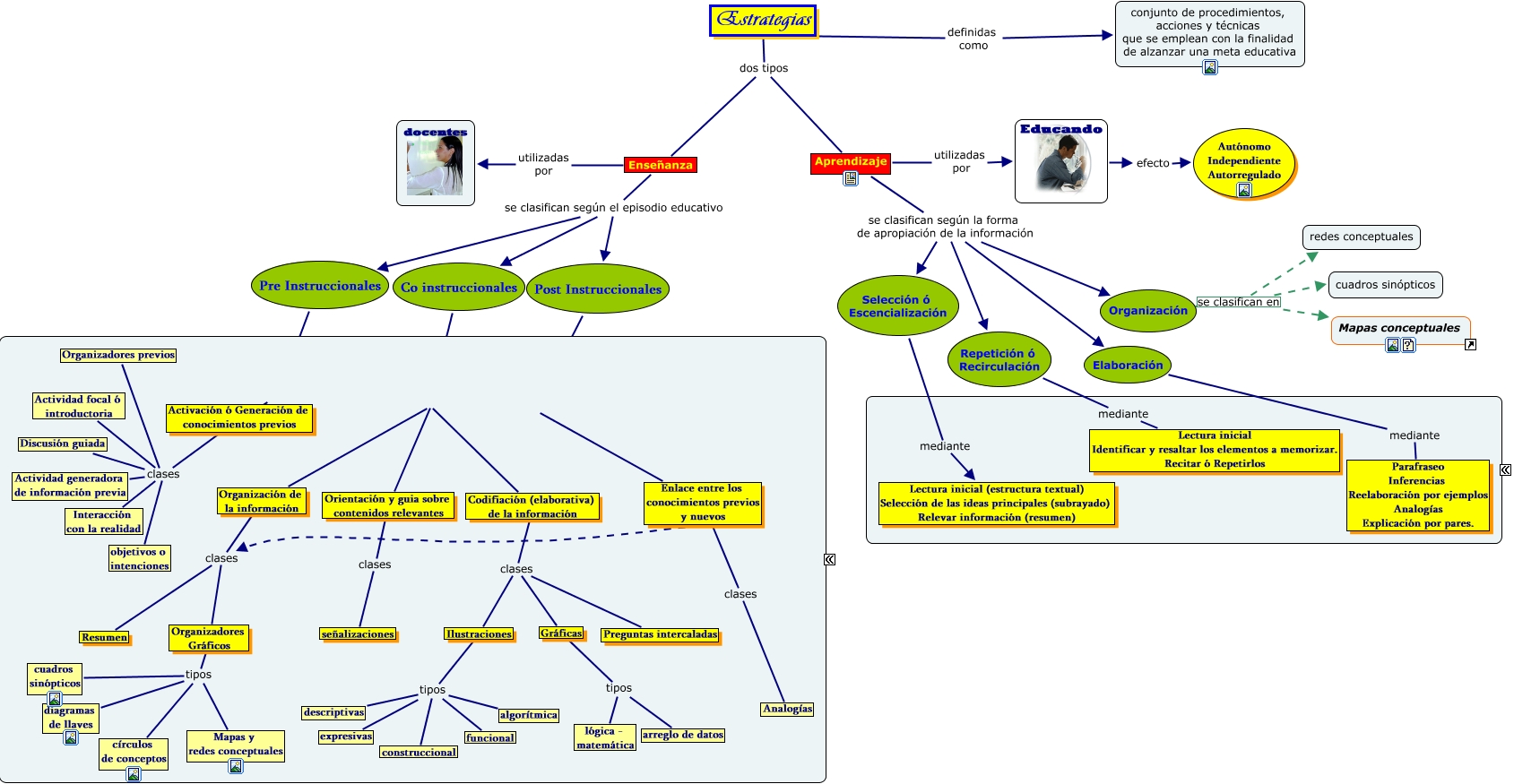 Este Cmap, tiene información relacionada con: estrategias de aprendizaje, Selección ó Escencialización mediante Lectura inicial (estructura textual) Selección de las ideas principales (subrayado) Relevar información (resumen), Enseñanza utilizadas por docentes, Aprendizaje utilizadas por Educando, Estrategias definidas como conjunto de procedimientos, acciones y técnicas que se emplean con la finalidad de alzanzar una meta educativa, Ilustraciones tipos expresivas, Organización de la información clases Resumen, Ilustraciones tipos algorítmica, Activación ó Generación de conocimientos previos clases Interacción con la realidad, Educando efecto Autónomo Independiente Autorregulado, Aprendizaje se clasifican según la forma de apropiación de la información Organización, Enlace entre los conocimientos previos y nuevos clases Organizadores Gráficos, Codifiación (elaborativa) de la información clases Ilustraciones, Activación ó Generación de conocimientos previos clases Actividad generadora de información previa, Ilustraciones tipos construccional, Codifiación (elaborativa) de la información clases Gráficas, Enseñanza se clasifican según el episodio educativo Co instruccionales, Pre Instruccionales estrategias de Activación ó Generación de conocimientos previos, Co instruccionales estrategias de Orientación y guia sobre contenidos relevantes, Ilustraciones tipos descriptivas, Organización de la información clases Organizadores Gráficos