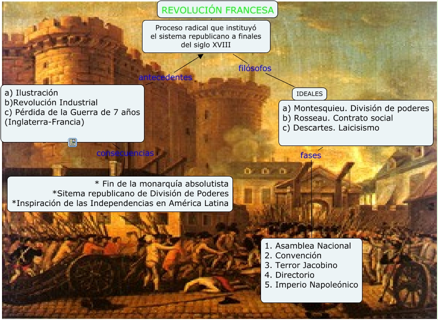 Este Cmap, tiene información relacionada con: revolución francesa, REVOLUCIÓN FRANCESA ???? Proceso radical que instituyó el sistema republicano a finales del siglo XVIII, IDEALES ???? a) Montesquieu. División de poderes b) Rosseau. Contrato social c) Descartes. Laicisismo, a) Montesquieu. División de poderes b) Rosseau. Contrato social c) Descartes. Laicisismo fases 1. Asamblea Nacional 2. Convención 3. Terror Jacobino 4. Directorio 5. Imperio Napoleónico, Proceso radical que instituyó el sistema republicano a finales del siglo XVIII filósofos IDEALES, a) Ilustración b)Revolución Industrial c) Pérdida de la Guerra de 7 años (Inglaterra-Francia) antecedentes Proceso radical que instituyó el sistema republicano a finales del siglo XVIII, a) Ilustración b)Revolución Industrial c) Pérdida de la Guerra de 7 años (Inglaterra-Francia) consecuencias * Fin de la monarquía absolutista *Sitema republicano de División de Poderes *Inspiración de las Independencias en América Latina