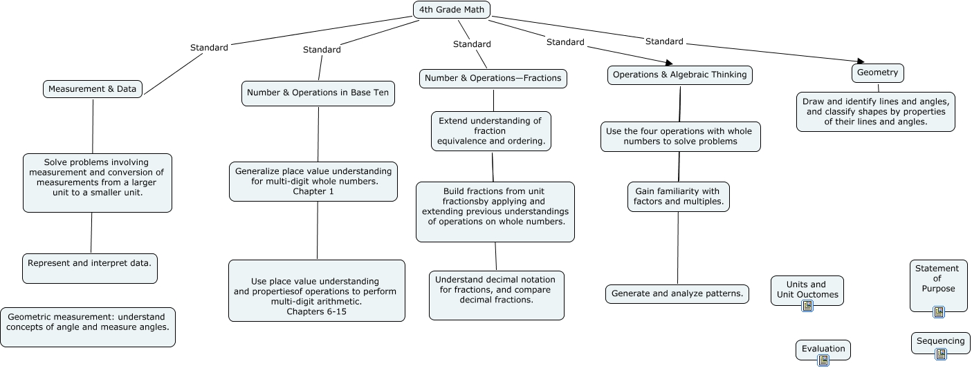 This Concept Map, created with IHMC CmapTools, has information related to: Dale Project 1, 4th Grade Math Standard Operations & Algebraic Thinking, 4th Grade Math Standard Geometry, Extend understanding of fraction equivalence and ordering. ???? Understand decimal notation for fractions, and compare decimal fractions., Extend understanding of fraction equivalence and ordering. ???? Build fractions from unit fractionsby applying and extending previous understandings of operations on whole numbers., 4th Grade Math Standard Number & Operations—Fractions, Operations & Algebraic Thinking ???? Gain familiarity with factors and multiples., Operations & Algebraic Thinking ???? Use the four operations with whole numbers to solve problems, Number & Operations—Fractions ???? Extend understanding of fraction equivalence and ordering., Measurement & Data ???? Represent and interpret data., Number & Operations in Base Ten ???? Use place value understanding and propertiesof operations to perform multi-digit arithmetic. Chapters 6-15, Operations & Algebraic Thinking ???? Generate and analyze patterns., 4th Grade Math Standard Measurement & Data, Geometry ???? Draw and identify lines and angles, and classify shapes by properties of their lines and angles., 4th Grade Math Standard Number & Operations in Base Ten