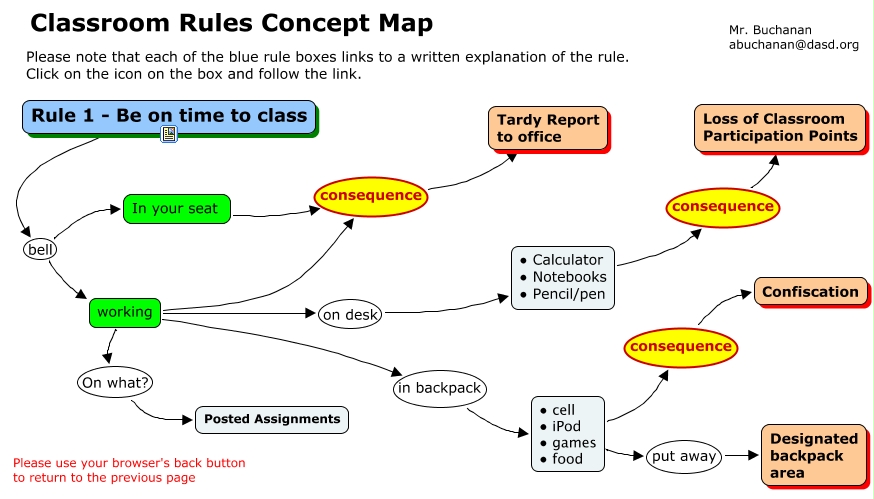 This Concept Map, created with IHMC CmapTools, has information related to: Rule 1 Be On Time, Rule 1 - Be on time to class bell In your seat, working consequence Tardy Report to office, ∙ cell ∙ iPod ∙ games ∙ food put away Designated backpack area, ∙ cell ∙ iPod ∙ games ∙ food consequence Confiscation, In your seat consequence Tardy Report to office, working On what? Posted Assignments, working in backpack ∙ cell ∙ iPod ∙ games ∙ food, working on desk ∙ Calculator ∙ Notebooks ∙ Pencil/pen, ∙ Calculator ∙ Notebooks ∙ Pencil/pen consequence Loss of Classroom Participation Points, Rule 1 - Be on time to class bell working