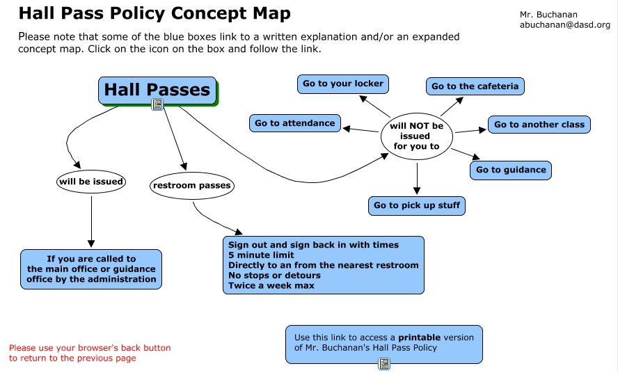 This Concept Map, created with IHMC CmapTools, has information related to: Hall Pass Poicy, Hall Passes will be issued If you are called to the main office or guidance office by the administration, Hall Passes restroom passes Sign out and sign back in with times 5 minute limit Directly to an from the nearest restroom No stops or detours Twice a week max, Hall Passes will NOT be issued for you to Go to attendance, Hall Passes will NOT be issued for you to Go to the cafeteria, Hall Passes will NOT be issued for you to Go to guidance, Hall Passes will NOT be issued for you to Go to pick up stuff, Hall Passes will NOT be issued for you to Go to your locker, Hall Passes will NOT be issued for you to Go to another class