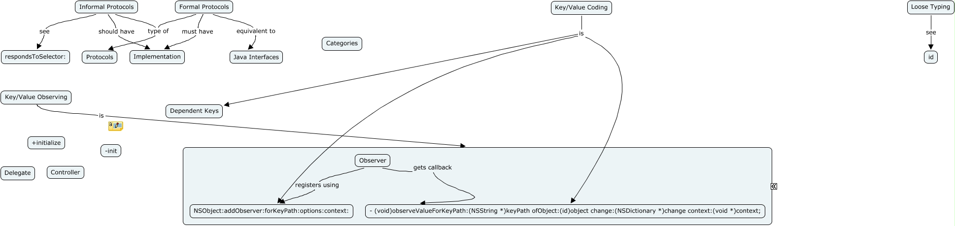 This Concept Map, created with IHMC CmapTools, has information related to: Cocoa, Observer registers using NSObject:addObserver:forKeyPath:options:context:, Formal Protocols equivalent to Java Interfaces, Key/Value Observing is ????, Informal Protocols type of Protocols, Key/Value Coding is Dependent Keys, Formal Protocols type of Protocols, Informal Protocols see respondsToSelector:, Informal Protocols should have Implementation, Formal Protocols must have Implementation, Key/Value Coding is NSObject:addObserver:forKeyPath:options:context:, Key/Value Coding is - (void)observeValueForKeyPath:(NSString *)keyPath ofObject:(id)object change:(NSDictionary *)change context:(void *)context;, Observer gets callback - (void)observeValueForKeyPath:(NSString *)keyPath ofObject:(id)object change:(NSDictionary *)change context:(void *)context;, Loose Typing see id