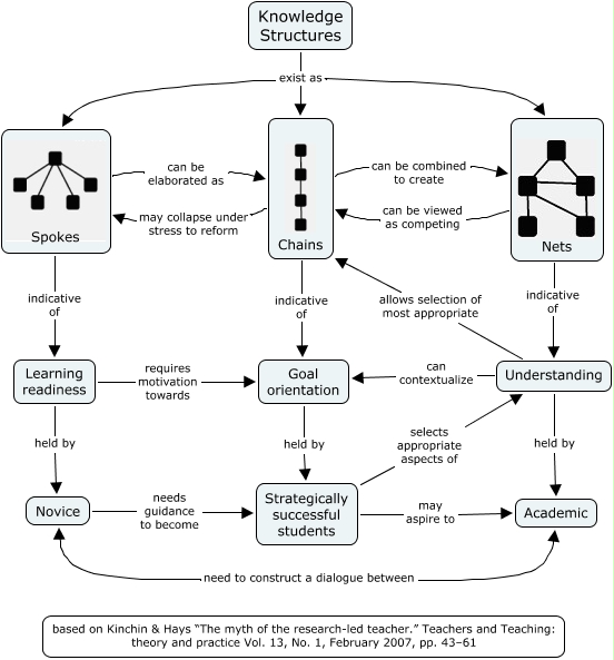 This Concept Map, created with IHMC CmapTools, has information related to: Morphology and Stages of Acedemic Development, Nets indicative of Understanding, Knowledge Structures exist as Spokes, Understanding can contextualize Goal orientation, Goal orientation held by Strategically successful students, Chains can be combined to create Nets, Understanding held by Academic, Chains indicative of Goal orientation, Strategically successful students may aspire to Academic, Learning readiness requires motivation towards Goal orientation, Understanding allows selection of most appropriate Chains, Knowledge Structures exist as Chains, Strategically successful students selects appropriate aspects of Understanding, Chains may collapse under stress to reform Spokes, Spokes can be elaborated as Chains, Nets can be viewed as competing Chains, Knowledge Structures exist as Nets, Learning readiness held by Novice, Spokes indicative of Learning readiness, Novice needs guidance to become Strategically successful students