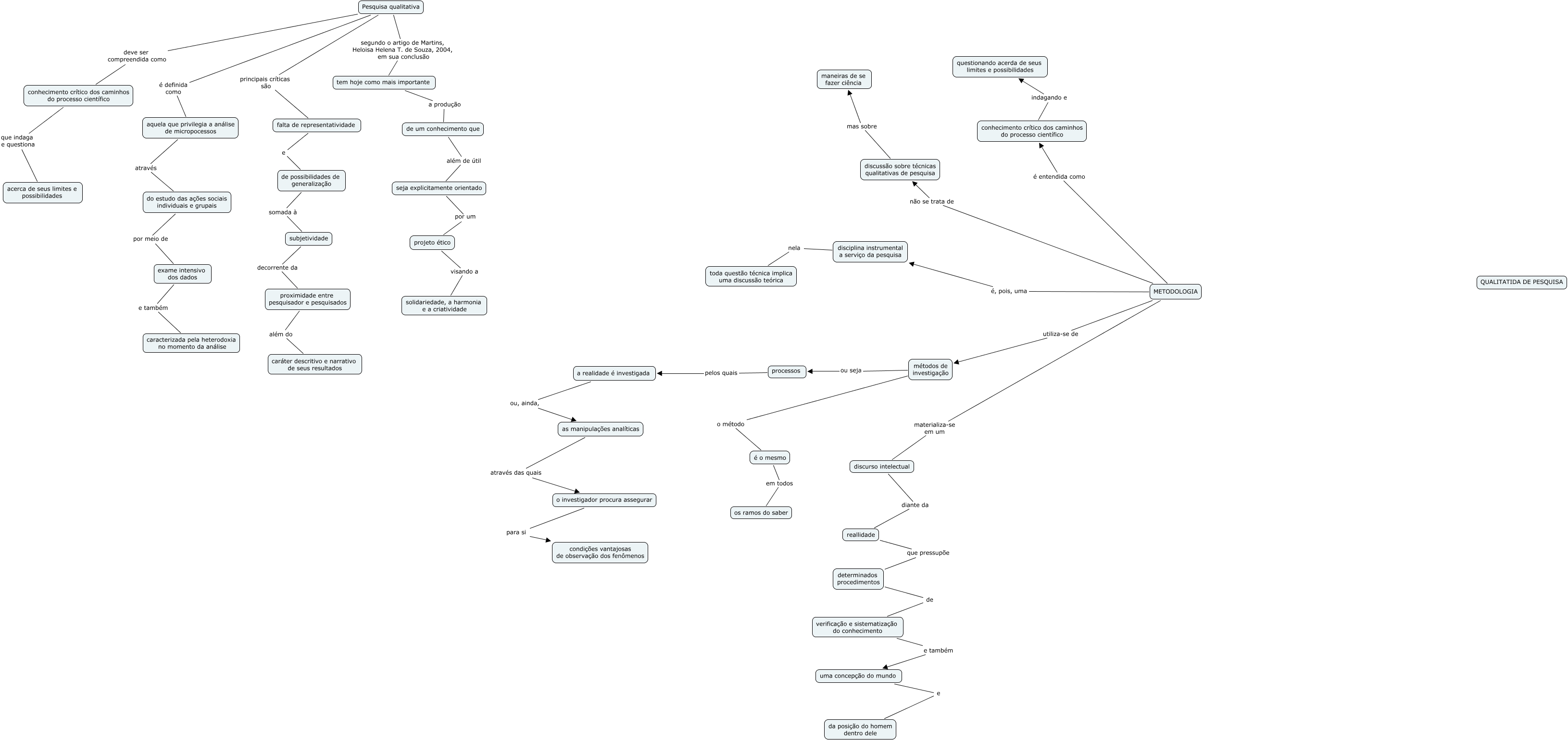 Esse mapa conceitual, produzido no IHMC CmapTools, tem a informação relacionada a: METODOLOGIA QUALITATIVA DE PESQUISA, tem hoje como mais importante a produção de um conhecimento que, determinados procedimentos de verificação e sistematização do conhecimento, conhecimento crítico dos caminhos do processo científico indagando e questionando acerda de seus limites e possibilidades, disciplina instrumental a serviço da pesquisa nela toda questão técnica implica uma discussão teórica, projeto ético visando a solidariedade, a harmonia e a criatividade, do estudo das ações sociais individuais e grupais por meio de exame intensivo dos dados, discussão sobre técnicas qualitativas de pesquisa mas sobre maneiras de se fazer ciência, METODOLOGIA não se trata de discussão sobre técnicas qualitativas de pesquisa, proximidade entre pesquisador e pesquisados além do caráter descritivo e narrativo de seus resultados, conhecimento crítico dos caminhos do processo científico que indaga e questiona acerca de seus limites e possibilidades, METODOLOGIA materializa-se em um discurso intelectual, de possibilidades de generalização somada à subjetividade, de um conhecimento que além de útil seja explicitamente orientado, reallidade que pressupõe determinados procedimentos, as manipulações analíticas através das quais o investigador procura assegurar, métodos de investigação o método é o mesmo, Pesquisa qualitativa é definida como aquela que privilegia a análise de micropocessos, métodos de investigação ou seja processos, Pesquisa qualitativa segundo o artigo de Martins, Heloisa Helena T. de Souza, 2004, em sua conclusão tem hoje como mais importante, processos pelos quais a realidade é investigada