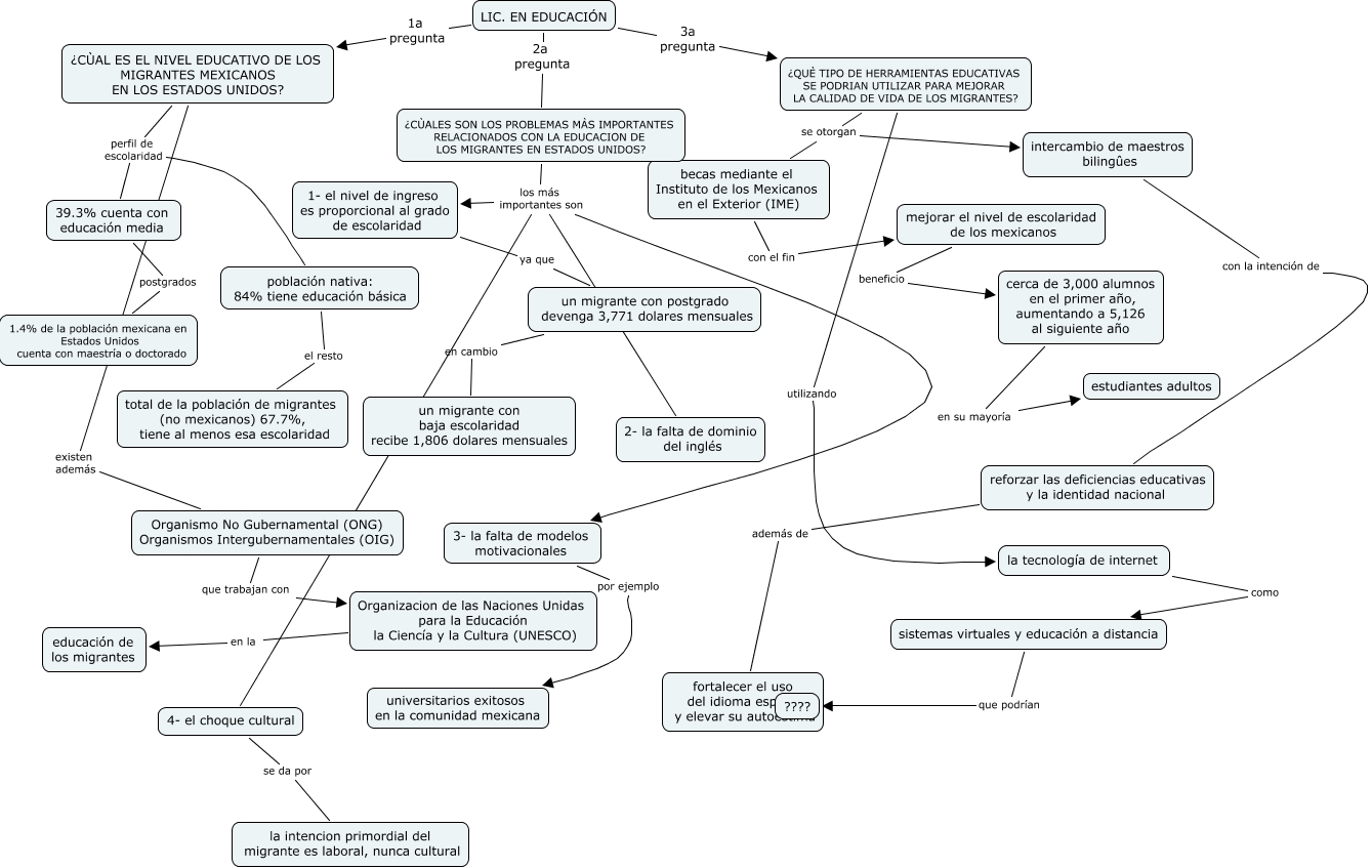 Este Cmap, tiene información relacionada con: LIC EN EDUCACION, ¿CÙALES SON LOS PROBLEMAS MÀS IMPORTANTES RELACIONADOS CON LA EDUCACION DE LOS MIGRANTES EN ESTADOS UNIDOS? los más importantes son 2- la falta de dominio del inglés, 4- el choque cultural se da por la intencion primordial del migrante es laboral, nunca cultural, ¿CÙALES SON LOS PROBLEMAS MÀS IMPORTANTES RELACIONADOS CON LA EDUCACION DE LOS MIGRANTES EN ESTADOS UNIDOS? los más importantes son 4- el choque cultural, LIC. EN EDUCACIÓN 1a pregunta ¿CÙAL ES EL NIVEL EDUCATIVO DE LOS MIGRANTES MEXICANOS EN LOS ESTADOS UNIDOS?, ¿CÙAL ES EL NIVEL EDUCATIVO DE LOS MIGRANTES MEXICANOS EN LOS ESTADOS UNIDOS? perfil de escolaridad población nativa: 84% tiene educación básica, becas mediante el Instituto de los Mexicanos en el Exterior (IME) con el fin mejorar el nivel de escolaridad de los mexicanos, ¿QUÈ TIPO DE HERRAMIENTAS EDUCATIVAS SE PODRIAN UTILIZAR PARA MEJORAR LA CALIDAD DE VIDA DE LOS MIGRANTES? se otorgan intercambio de maestros bilingûes, LIC. EN EDUCACIÓN 3a pregunta ¿QUÈ TIPO DE HERRAMIENTAS EDUCATIVAS SE PODRIAN UTILIZAR PARA MEJORAR LA CALIDAD DE VIDA DE LOS MIGRANTES?, un migrante con postgrado devenga 3,771 dolares mensuales en cambio un migrante con baja escolaridad recibe 1,806 dolares mensuales, Organismo No Gubernamental (ONG) Organismos Intergubernamentales (OIG) que trabajan con Organizacion de las Naciones Unidas para la Educación la Ciencía y la Cultura (UNESCO), población nativa: 84% tiene educación básica el resto total de la población de migrantes (no mexicanos) 67.7%, tiene al menos esa escolaridad, 3- la falta de modelos motivacionales por ejemplo universitarios exitosos en la comunidad mexicana, ¿QUÈ TIPO DE HERRAMIENTAS EDUCATIVAS SE PODRIAN UTILIZAR PARA MEJORAR LA CALIDAD DE VIDA DE LOS MIGRANTES? utilizando la tecnología de internet, ¿CÙALES SON LOS PROBLEMAS MÀS IMPORTANTES RELACIONADOS CON LA EDUCACION DE LOS MIGRANTES EN ESTADOS UNIDOS? los más importantes son 3- la falta de modelos motivacionales, intercambio de maestros bilingûes con la intención de reforzar las deficiencias educativas y la identidad nacional, Organizacion de las Naciones Unidas para la Educación la Ciencía y la Cultura (UNESCO) en la educación de los migrantes, mejorar el nivel de escolaridad de los mexicanos beneficio cerca de 3,000 alumnos en el primer año, aumentando a 5,126 al siguiente año, reforzar las deficiencias educativas y la identidad nacional además de fortalecer el uso del idioma español y elevar su autoestima, 1- el nivel de ingreso es proporcional al grado de escolaridad ya que un migrante con postgrado devenga 3,771 dolares mensuales, sistemas virtuales y educación a distancia que podrían ????