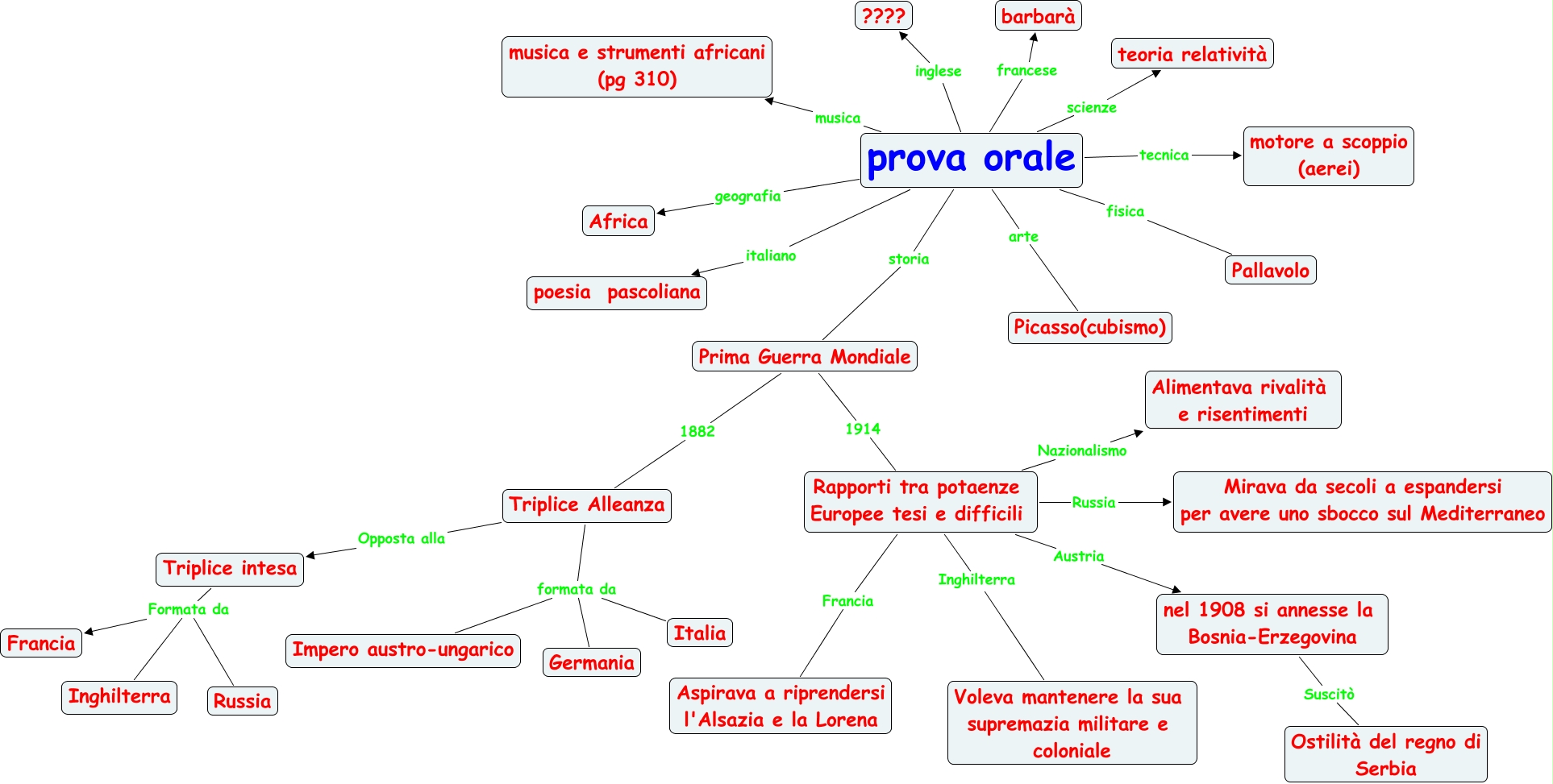 Questa Cmap, creata con IHMC CmapTools, contiene informazioni relative a: mappa esame christian, nel 1908 si annesse la Bosnia-Erzegovina Suscitò Ostilità del regno di Serbia, Rapporti tra potaenze Europee tesi e difficili Austria nel 1908 si annesse la Bosnia-Erzegovina, prova orale inglese ????, prova orale scienze teoria relatività, Triplice intesa Formata da Inghilterra, Triplice Alleanza Opposta alla Triplice intesa, Rapporti tra potaenze Europee tesi e difficili Russia Mirava da secoli a espandersi per avere uno sbocco sul Mediterraneo, prova orale arte Picasso(cubismo), Rapporti tra potaenze Europee tesi e difficili Nazionalismo Alimentava rivalità e risentimenti, Prima Guerra Mondiale 1882 Triplice Alleanza, prova orale fisica Pallavolo, Prima Guerra Mondiale 1914 Rapporti tra potaenze Europee tesi e difficili, prova orale tecnica motore a scoppio (aerei), Triplice Alleanza formata da Italia, prova orale musica musica e strumenti africani (pg 310), Rapporti tra potaenze Europee tesi e difficili Inghilterra Voleva mantenere la sua supremazia militare e coloniale, Triplice intesa Formata da Russia, Rapporti tra potaenze Europee tesi e difficili Francia Aspirava a riprendersi l'Alsazia e la Lorena, Triplice Alleanza formata da Germania, prova orale italiano poesia pascoliana