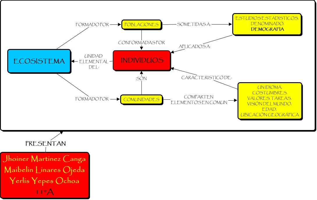 Este Cmap, tiene información relacionada con: JHOINER, COMUNIDADES SON INDIVIDUOS, UN IDIOMA, COSTUMBRES, VALORES, TAREAS, VISIÓN DEL MUNDO, EDAD, UBICACIÓN GEOGRÁFICA CARACTERISTICO DE: INDIVIDUOS, ESTUDIOS ESTADISTICOS, DENOMINADO; DEMOGRAFIA APLICADOS A: INDIVIDUOS, POBLACIONES SOMETIDAS A: ESTUDIOS ESTADISTICOS, DENOMINADO; DEMOGRAFIA, POBLACIONES CONFORMADAS POR INDIVIDUOS, COMUNIDADES COMPARTEN ELEMENTOS EN COMUN UN IDIOMA, COSTUMBRES, VALORES, TAREAS, VISIÓN DEL MUNDO, EDAD, UBICACIÓN GEOGRÁFICA, Jhoiner Martinez Canga Maibelin Linares Ojeda Yerlis Yepes Ochoa 11ºA PRESENTAN, ECOSISTEMA FORMADO POR COMUNIDADES, INDIVIDUOS UNIDAD ELEMENTAL DEL: ECOSISTEMA, UN IDIOMA, COSTUMBRES, VALORES, TAREAS, VISIÓN DEL MUNDO, EDAD, UBICACIÓN GEOGRÁFICA CARACTERISTICO DE: INDIVIDUOS, ECOSISTEMA FORMADO POR POBLACIONES