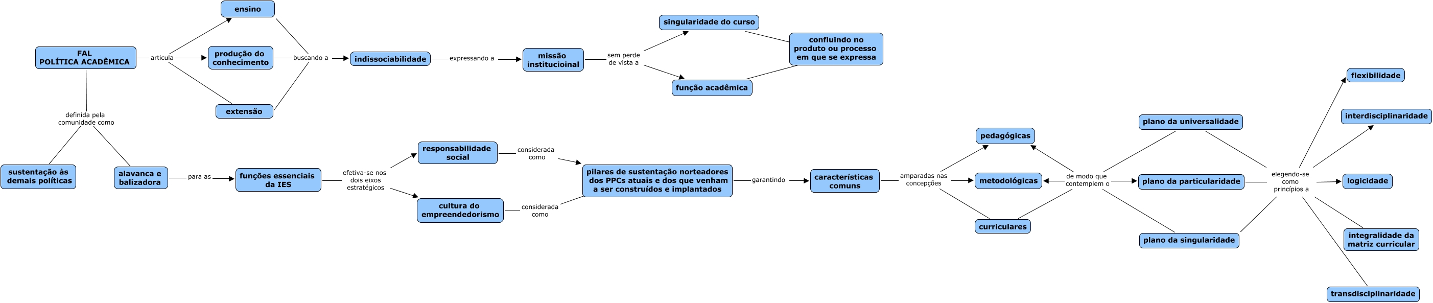 Esse mapa conceitual, produzido no IHMC CmapTools, tem a informação relacionada a: FAL POLÍTICA ACADÊMICA, plano da universalidade elegendo-se como princípios a plano da singularidade, função acadêmica ???? confluindo no produto ou processo em que se expressa, FAL POLÍTICA ACADÊMICA articula ensino, plano da particularidade elegendo-se como princípios a transdisciplinaridade, plano da universalidade elegendo-se como princípios a logicidade, missão institucioinal sem perde de vista a função acadêmica, plano da universalidade elegendo-se como princípios a transdisciplinaridade, cultura do empreendedorismo considerada como ????, plano da universalidade de modo que contemplem o plano da particularidade, plano da particularidade elegendo-se como princípios a logicidade, plano da particularidade elegendo-se como princípios a integralidade da matriz curricular, características comuns amparadas nas concepções curriculares, alavanca e balizadora para as funções essenciais da IES, funções essenciais da IES efetiva-se nos dois eixos estratégicos cultura do empreendedorismo, plano da universalidade de modo que contemplem o plano da singularidade, plano da universalidade de modo que contemplem o curriculares, ensino buscando a extensão, responsabilidade social considerada como pilares de sustentação norteadores dos PPCs atuais e dos que venham a ser construídos e implantados, funções essenciais da IES efetiva-se nos dois eixos estratégicos responsabilidade social, plano da particularidade elegendo-se como princípios a interdisciplinaridade