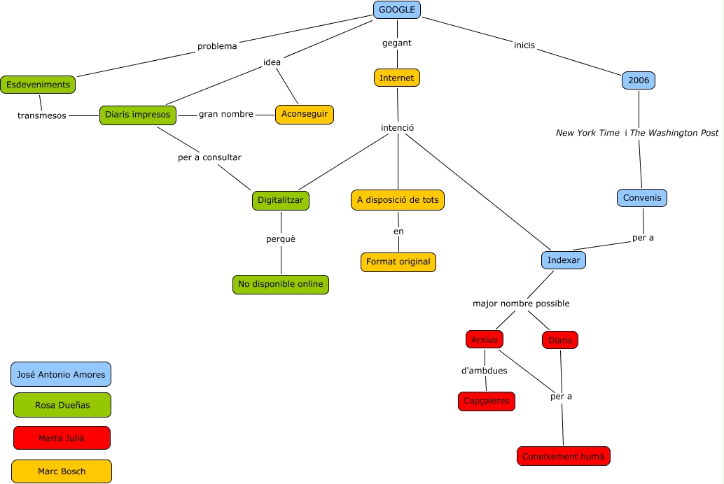 Este Cmap, tiene información relacionada con: UF2 Gestió_diaris Google, A disposició de tots en Format original, Arxius d'ambdues Capçaleres, Esdeveniments transmesos Diaris impresos, GOOGLE inicis 2006, Aconseguir gran nombre Diaris impresos, Indexar major nombre possible Diaris, Convenis per a Indexar, Diaris impresos per a consultar Digitalitzar, Diaris per a Coneixement humà, Internet intenció Indexar, Arxius per a Coneixement humà, GOOGLE idea Diaris impresos, Internet intenció A disposició de tots, Digitalitzar perquè No disponible online, GOOGLE problema Esdeveniments, Internet intenció Digitalitzar, 2006 New York Time i The Washington Post Convenis, Indexar major nombre possible Arxius, GOOGLE gegant Internet, GOOGLE idea Aconseguir