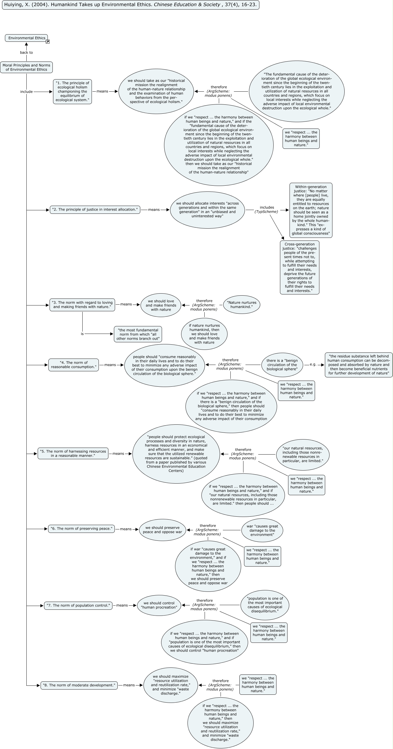 This Concept Map, created with IHMC CmapTools, has information related to: Huiying_principles-of-environm-ethics, "Nature nurtures humankind." therefore (ArgScheme: modus ponens) we should love and make friends with nature, "population is one of the most important causes of ecological disequilibrium." therefore (ArgScheme: modus ponens) we should control "human procreation", "4. The norm of reasonable consumption." means people should "consume reasonably in their daily lives and to do their best to minimize any adverse impact of their consumption upon the benign circulation of the biological sphere.", if war "causes great damage to the environment," and if we "respect ... the harmony between human beings and nature," then we should preserve peace and oppose war therefore (ArgScheme: modus ponens) we should preserve peace and oppose war, we "respect ... the harmony between human beings and nature." therefore (ArgScheme: modus ponens) people should "consume reasonably in their daily lives and to do their best to minimize any adverse impact of their consumption upon the benign circulation of the biological sphere.", Moral Principles and Norms of Environmental Ethics include "2. The principle of justice in interest allocation.", "6. The norm of preserving peace." means we should preserve peace and oppose war, war "causes great damage to the environment" therefore (ArgScheme: modus ponens) we should preserve peace and oppose war, there is a "benign circulation of the biological sphere" therefore (ArgScheme: modus ponens) people should "consume reasonably in their daily lives and to do their best to minimize any adverse impact of their consumption upon the benign circulation of the biological sphere.", Moral Principles and Norms of Environmental Ethics include "5. The norm of harnessing resources in a reasonable manner.", Moral Principles and Norms of Environmental Ethics include "7. The norm of population control.", we should allocate interests "across generations and within the same generation" in an "unbiased and uninterested way" includes (TypScheme) Cross-generation justice: "challenges people of the pre- sent times not to, while attempting to fulfill their needs and interests, deprive the future generations of their rights to fulfill their needs and interests.", if we "respect ... the harmony between human beings and nature," and if there is a "benign circulation of the biological sphere," then people should "consume reasonably in their daily lives and to do their best to minimize any adverse impact of their consumption therefore (ArgScheme: modus ponens) people should "consume reasonably in their daily lives and to do their best to minimize any adverse impact of their consumption upon the benign circulation of the biological sphere.", Moral Principles and Norms of Environmental Ethics include "1. The principle of ecological holism championing the equilibrium of ecological system.", "The fundamental cause of the deter- ioration of the global ecological environ- ment since the beginning of the twen- tieth century lies in the exploitation and utilization of natural resources in all countries and regions, which focus on local interests while neglecting the adverse impact of local environmental destruction upon the ecological whole." therefore (ArgScheme: modus ponens) we should take as our "historical mission the realignment of the human-nature relationship and the examination of human behaviors from the per- spective of ecological holism.", "3. The norm with regard to loving and making friends with nature." is "the most fundamental norm from which "all other norms branch out", we "respect ... the harmony between human beings and nature." therefore (ArgScheme: modus ponens) we should maximize "resource utilization and reutilization rate," and minimize "waste discharge.", if we "respect ... the harmony between human beings and nature," then we should maximize "resource utilization and reutilization rate," and minimize "waste discharge." therefore (ArgScheme: modus ponens) we should maximize "resource utilization and reutilization rate," and minimize "waste discharge.", if we "respect ... the harmony between human beings and nature," and if "population is one of the most important causes of ecological disequilibrium," then we should control "human procreation" therefore (ArgScheme: modus ponens) we should control "human procreation", we "respect ... the harmony between human beings and nature." therefore (ArgScheme: modus ponens) we should take as our "historical mission the realignment of the human-nature relationship and the examination of human behaviors from the per- spective of ecological holism."