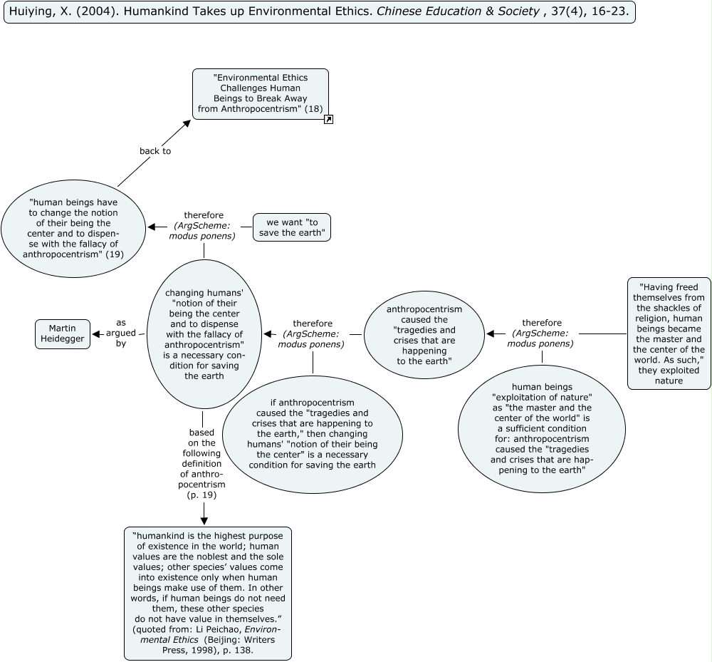 This Concept Map, created with IHMC CmapTools, has information related to: Huiying-anthropocentrism, "human beings have to change the notion of their being the center and to dispen- se with the fallacy of anthropocentrism" (19) back to "Environmental Ethics Challenges Human Beings to Break Away from Anthropocentrism" (18), we want "to save the earth" therefore (ArgScheme: modus ponens) "human beings have to change the notion of their being the center and to dispen- se with the fallacy of anthropocentrism" (19), if anthropocentrism caused the "tragedies and crises that are happening to the earth," then changing humans' "notion of their being the center" is a necessary condition for saving the earth therefore (ArgScheme: modus ponens) changing humans' "notion of their being the center and to dispense with the fallacy of anthropocentrism" is a necessary con- dition for saving the earth, "Having freed themselves from the shackles of religion, human beings became the master and the center of the world. As such," they exploited nature therefore (ArgScheme: modus ponens) anthropocentrism caused the "tragedies and crises that are happening to the earth", anthropocentrism caused the "tragedies and crises that are happening to the earth" therefore (ArgScheme: modus ponens) changing humans' "notion of their being the center and to dispense with the fallacy of anthropocentrism" is a necessary con- dition for saving the earth, changing humans' "notion of their being the center and to dispense with the fallacy of anthropocentrism" is a necessary con- dition for saving the earth therefore (ArgScheme: modus ponens) "human beings have to change the notion of their being the center and to dispen- se with the fallacy of anthropocentrism" (19), changing humans' "notion of their being the center and to dispense with the fallacy of anthropocentrism" is a necessary con- dition for saving the earth as argued by Martin Heidegger, changing humans' "notion of their being the center and to dispense with the fallacy of anthropocentrism" is a necessary con- dition for saving the earth based on the following definition of anthro- pocentrism (p. 19) “humankind is the highest purpose of existence in the world; human values are the noblest and the sole values; other species’ values come into existence only when human beings make use of them. In other words, if human beings do not need them, these other species do not have value in themselves.” (quoted from: Li Peichao, Environ- mental Ethics (Beijing: Writers Press, 1998), p. 138., human beings "exploitation of nature" as "the master and the center of the world" is a sufficient condition for: anthropocentrism caused the "tragedies and crises that are hap- pening to the earth" therefore (ArgScheme: modus ponens) anthropocentrism caused the "tragedies and crises that are happening to the earth"