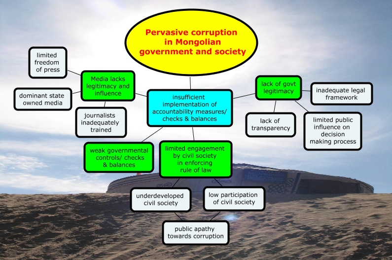 This Concept Map, created with IHMC CmapTools, has information related to: Mongolia Situation Tree, lack of govt legitimacy inadequate legal framework, low participation of civil society public apathy towards corruption, Media lacks legitimacy and influence dominant state owned media, limited public influence on decision making process lack of govt legitimacy, Media lacks legitimacy and influence limited freedom of press, Media lacks legitimacy and influence journalists inadequately trained, underdeveloped civil society public apathy towards corruption, insufficient implementation of accountability measures/ checks & balances lack of govt legitimacy, limited engagement by civil society in enforcing rule of law underdeveloped civil society, insufficient implementation of accountability measures/ checks & balances limited engagement by civil society in enforcing rule of law, lack of transparency lack of govt legitimacy, Media lacks legitimacy and influence insufficient implementation of accountability measures/ checks & balances, limited engagement by civil society in enforcing rule of law low participation of civil society, Pervasive corruption in Mongolian government and society insufficient implementation of accountability measures/ checks & balances, insufficient implementation of accountability measures/ checks & balances weak governmental controls/ checks & balances