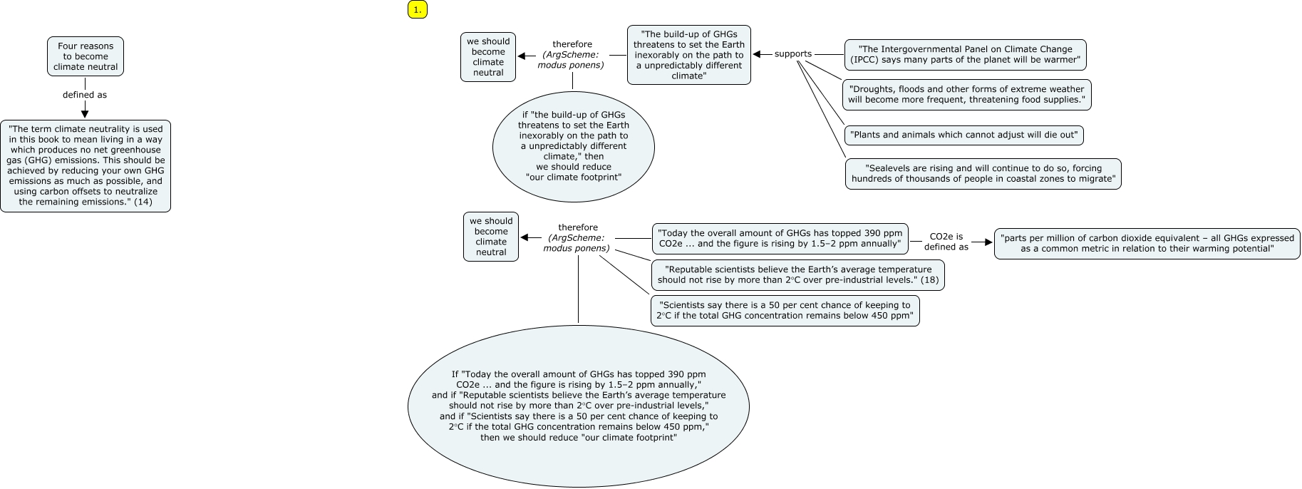 This Concept Map, created with IHMC CmapTools, has information related to: UNEP_2009_4 reasons to become climate neutral, "Sealevels are rising and will continue to do so, forcing hundreds of thousands of people in coastal zones to migrate" supports "The build-up of GHGs threatens to set the Earth inexorably on the path to a unpredictably different climate", Four reasons to become climate neutral defined as "The term climate neutrality is used in this book to mean living in a way which produces no net greenhouse gas (GHG) emissions. This should be achieved by reducing your own GHG emissions as much as possible, and using carbon offsets to neutralize the remaining emissions." (14), "Plants and animals which cannot adjust will die out" supports "The build-up of GHGs threatens to set the Earth inexorably on the path to a unpredictably different climate", "The Intergovernmental Panel on Climate Change (IPCC) says many parts of the planet will be warmer" supports "The build-up of GHGs threatens to set the Earth inexorably on the path to a unpredictably different climate", "Reputable scientists believe the Earth’s average temperature should not rise by more than 2°C over pre-industrial levels." (18) therefore (ArgScheme: modus ponens) we should become climate neutral, If "Today the overall amount of GHGs has topped 390 ppm CO2e ... and the figure is rising by 1.5–2 ppm annually," and if "Reputable scientists believe the Earth’s average temperature should not rise by more than 2°C over pre-industrial levels," and if "Scientists say there is a 50 per cent chance of keeping to 2°C if the total GHG concentration remains below 450 ppm," then we should reduce "our climate footprint" therefore (ArgScheme: modus ponens) we should become climate neutral, "Today the overall amount of GHGs has topped 390 ppm CO2e ... and the figure is rising by 1.5–2 ppm annually" CO2e is defined as "parts per million of carbon dioxide equivalent – all GHGs expressed as a common metric in relation to their warming potential", "Droughts, floods and other forms of extreme weather will become more frequent, threatening food supplies." supports "The build-up of GHGs threatens to set the Earth inexorably on the path to a unpredictably different climate", "Scientists say there is a 50 per cent chance of keeping to 2°C if the total GHG concentration remains below 450 ppm" therefore (ArgScheme: modus ponens) we should become climate neutral, "Today the overall amount of GHGs has topped 390 ppm CO2e ... and the figure is rising by 1.5–2 ppm annually" therefore (ArgScheme: modus ponens) we should become climate neutral, "The build-up of GHGs threatens to set the Earth inexorably on the path to a unpredictably different climate" therefore (ArgScheme: modus ponens) we should become climate neutral, if "the build-up of GHGs threatens to set the Earth inexorably on the path to a unpredictably different climate," then we should reduce "our climate footprint" therefore (ArgScheme: modus ponens) we should become climate neutral