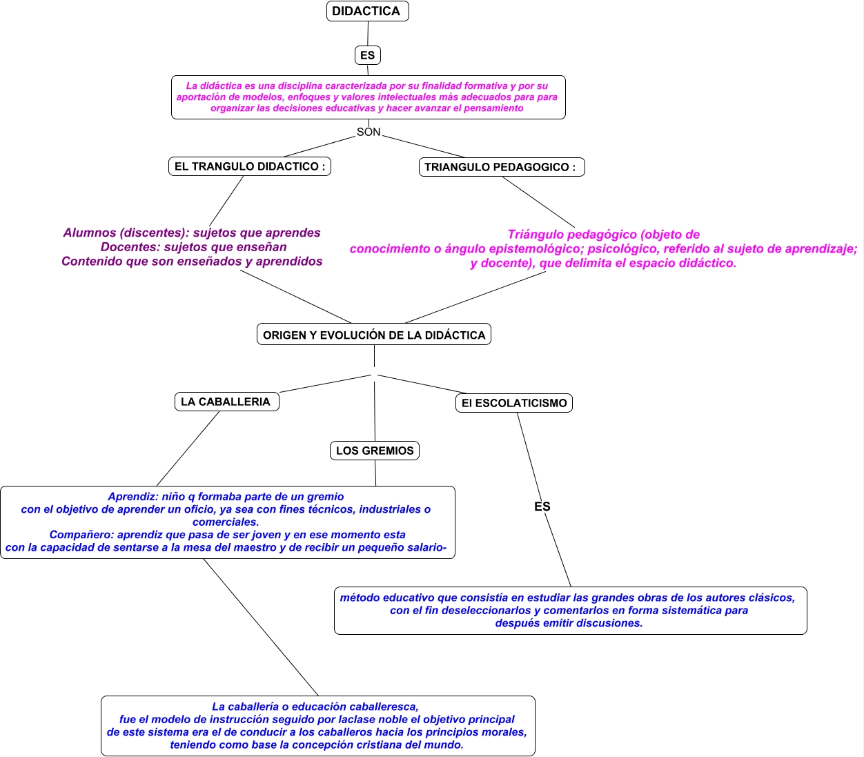 Este Cmap, tiene información relacionada con: ENTREVISTA, LOS GREMIOS LA CABALLERIA, LA CABALLERIA ES La caballería o educación caballeresca, fue el modelo de instrucción seguido por laclase noble el objetivo principal de este sistema era el de conducir a los caballeros hacia los principios morales, teniendo como base la concepción cristiana del mundo., LOS GREMIOS SON Aprendiz: niño q formaba parte de un gremio con el objetivo de aprender un oficio, ya sea con fines técnicos, industriales o comerciales. Compañero: aprendiz que pasa de ser joven y en ese momento esta con la capacidad de sentarse a la mesa del maestro y de recibir un pequeño salario-, La didáctica es una disciplina caracterizada por su finalidad formativa y por su aportación de modelos, enfoques y valores intelectuales más adecuados para para organizar las decisiones educativas y hacer avanzar el pensamiento SON TRIANGULO PEDAGOGICO :, EL TRANGULO DIDACTICO : Alumnos (discentes): sujetos que aprendes Docentes: sujetos que enseñan Contenido que son enseñados y aprendidos ORIGEN Y EVOLUCIÓN DE LA DIDÁCTICA, La didáctica es una disciplina caracterizada por su finalidad formativa y por su aportación de modelos, enfoques y valores intelectuales más adecuados para para organizar las decisiones educativas y hacer avanzar el pensamiento ???? DIDACTICA, La didáctica es una disciplina caracterizada por su finalidad formativa y por su aportación de modelos, enfoques y valores intelectuales más adecuados para para organizar las decisiones educativas y hacer avanzar el pensamiento ???? ES, El ESCOLATICISMO LA CABALLERIA, La didáctica es una disciplina caracterizada por su finalidad formativa y por su aportación de modelos, enfoques y valores intelectuales más adecuados para para organizar las decisiones educativas y hacer avanzar el pensamiento SON EL TRANGULO DIDACTICO :, ORIGEN Y EVOLUCIÓN DE LA DIDÁCTICA LA CABALLERIA, El ESCOLATICISMO ES método educativo que consistía en estudiar las grandes obras de los autores clásicos, con el fin deseleccionarlos y comentarlos en forma sistemática para después emitir discusiones., ORIGEN Y EVOLUCIÓN DE LA DIDÁCTICA Triángulo pedagógico (objeto de conocimiento o ángulo epistemológico; psicológico, referido al sujeto de aprendizaje; y docente), que delimita el espacio didáctico. TRIANGULO PEDAGOGICO :