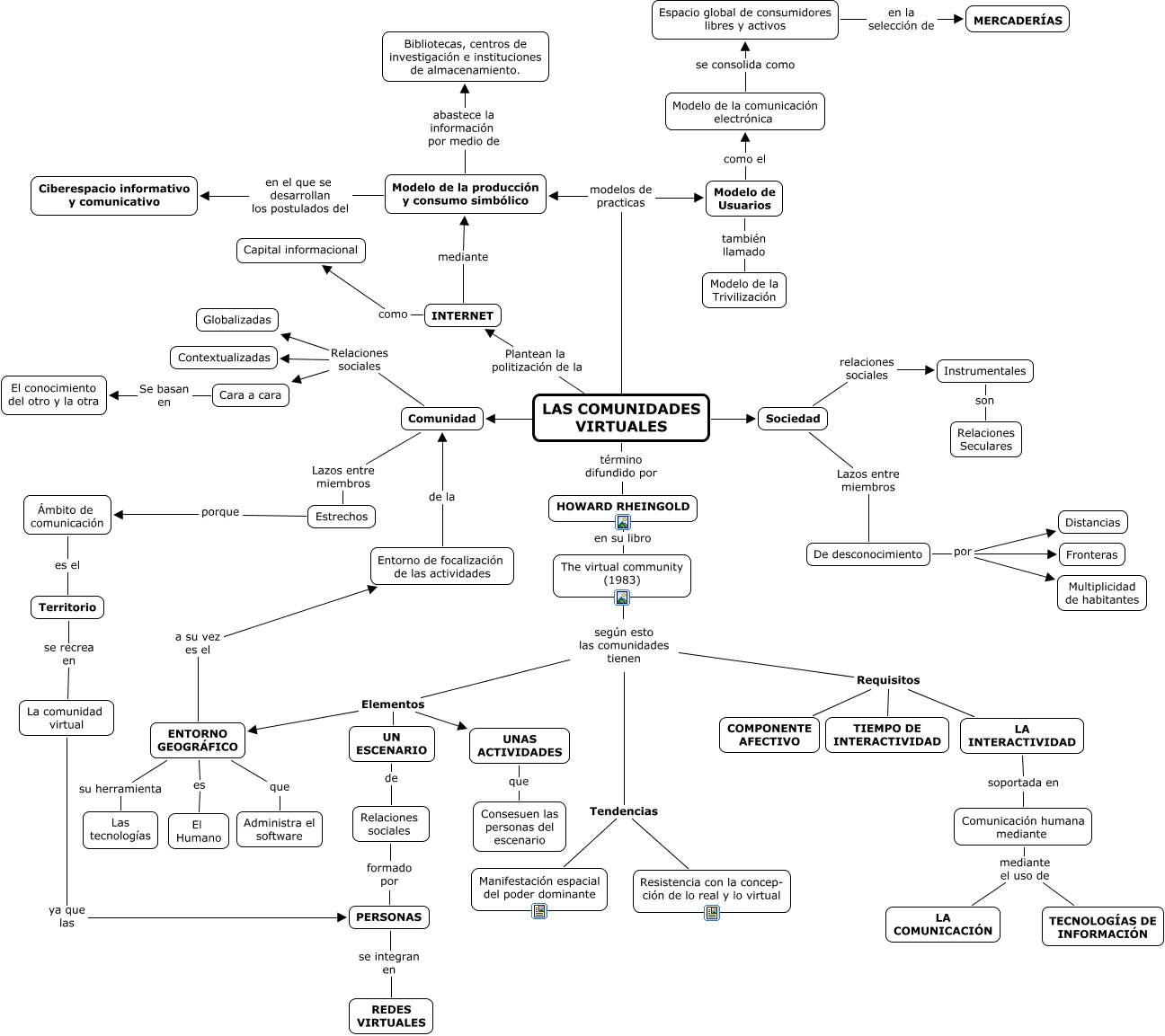 Este Cmap, tiene información relacionada con: CV, Modelo de la producción y consumo simbólico abastece la información por medio de Bibliotecas, centros de investigación e instituciones de almacenamiento., INTERNET como Capital informacional, Comunidad Relaciones sociales Cara a cara, Instrumentales son Relaciones Seculares, De desconocimiento por Multiplicidad de habitantes, Modelo de Usuarios también llamado Modelo de la Trivilización, Comunicación humana mediante mediante el uso de TECNOLOGÍAS DE INFORMACIÓN, The virtual community (1983) según esto las comunidades tienen, LAS COMUNIDADES VIRTUALES Comunidad, según esto las comunidades tienen Requisitos COMPONENTE AFECTIVO, Territorio se recrea en La comunidad virtual, ENTORNO GEOGRÁFICO es El Humano, Modelo de la comunicación electrónica se consolida como Espacio global de consumidores libres y activos, ENTORNO GEOGRÁFICO a su vez es el Entorno de focalización de las actividades, según esto las comunidades tienen Requisitos LA INTERACTIVIDAD, Comunidad Relaciones sociales Globalizadas, según esto las comunidades tienen Tendencias Manifestación espacial del poder dominante, según esto las comunidades tienen Elementos UN ESCENARIO, según esto las comunidades tienen Tendencias Resistencia con la concep- ción de lo real y lo virtual, Modelo de la producción y consumo simbólico en el que se desarrollan los postulados del Ciberespacio informativo y comunicativo