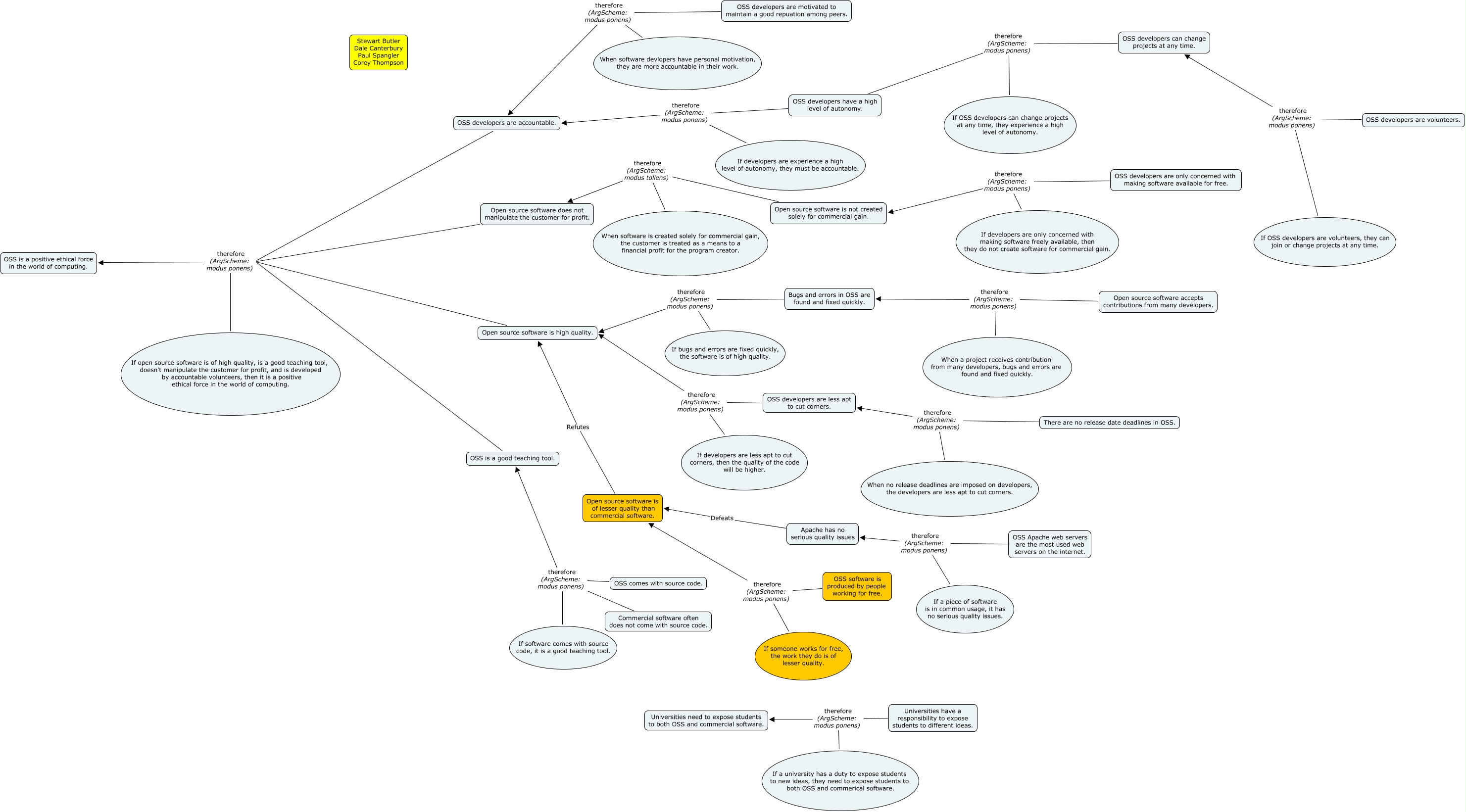 This Concept Map, created with IHMC CmapTools, has information related to: Project CMAP 1, If developers are less apt to cut corners, then the quality of the code will be higher. therefore (ArgScheme: modus ponens) Open source software is high quality., Open source software is of lesser quality than commercial software. Refutes Open source software is high quality., When no release deadlines are imposed on developers, the developers are less apt to cut corners. therefore (ArgScheme: modus ponens) OSS developers are less apt to cut corners., Open source software accepts contributions from many developers. therefore (ArgScheme: modus ponens) Bugs and errors in OSS are found and fixed quickly., When a project receives contribution from many developers, bugs and errors are found and fixed quickly. therefore (ArgScheme: modus ponens) Bugs and errors in OSS are found and fixed quickly., OSS developers have a high level of autonomy. therefore (ArgScheme: modus ponens) OSS developers are accountable., OSS developers are motivated to maintain a good repuation among peers. therefore (ArgScheme: modus ponens) OSS developers are accountable., Open source software does not manipulate the customer for profit. therefore (ArgScheme: modus ponens) OSS is a positive ethical force in the world of computing., If software comes with source code, it is a good teaching tool. therefore (ArgScheme: modus ponens) OSS is a good teaching tool., If OSS developers are volunteers, they can join or change projects at any time. therefore (ArgScheme: modus ponens) OSS developers can change projects at any time., OSS software is produced by people working for free. therefore (ArgScheme: modus ponens) Open source software is of lesser quality than commercial software., OSS developers are less apt to cut corners. therefore (ArgScheme: modus ponens) Open source software is high quality., Commercial software often does not come with source code. therefore (ArgScheme: modus ponens) OSS is a good teaching tool., Universities have a responsibility to expose students to different ideas. therefore (ArgScheme: modus ponens) Universities need to expose students to both OSS and commercial software., OSS developers are accountable. therefore (ArgScheme: modus ponens) OSS is a positive ethical force in the world of computing., When software devlopers have personal motivation, they are more accountable in their work. therefore (ArgScheme: modus ponens) OSS developers are accountable., OSS Apache web servers are the most used web servers on the internet. therefore (ArgScheme: modus ponens) Apache has no serious quality issues, OSS developers can change projects at any time. therefore (ArgScheme: modus ponens) OSS developers have a high level of autonomy., Open source software is high quality. therefore (ArgScheme: modus ponens) OSS is a positive ethical force in the world of computing., If a university has a duty to expose students to new ideas, they need to expose students to both OSS and commerical software. therefore (ArgScheme: modus ponens) Universities need to expose students to both OSS and commercial software.