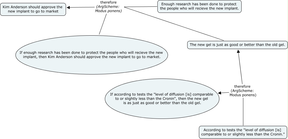 This Concept Map, created with IHMC CmapTools, has information related to: Breast 5 Wellington, Enough research has been done to protect the people who will recieve the new implant. therefore (ArgScheme: Modus ponens) Kim Anderson should approve the new implant to go to market, According to tests the "level of diffusion [is] comparable to or slightly less than the Cronin." therefore (ArgScheme: Modus ponens) The new gel is just as good or better than the old gel., If enough research has been done to protect the people who will recieve the new implant, then Kim Anderson should approve the new implant to go to market. therefore (ArgScheme: Modus ponens) Kim Anderson should approve the new implant to go to market, According to tests the "level of diffusion [is] comparable to or slightly less than the Cronin." therefore (ArgScheme: Modus ponens) If according to tests the "level of diffusion [is] comparable to or slightly less than the Cronin", then the new gel is as just as good or better than the old gel., The new gel is just as good or better than the old gel. therefore (ArgScheme: Modus ponens) Kim Anderson should approve the new implant to go to market