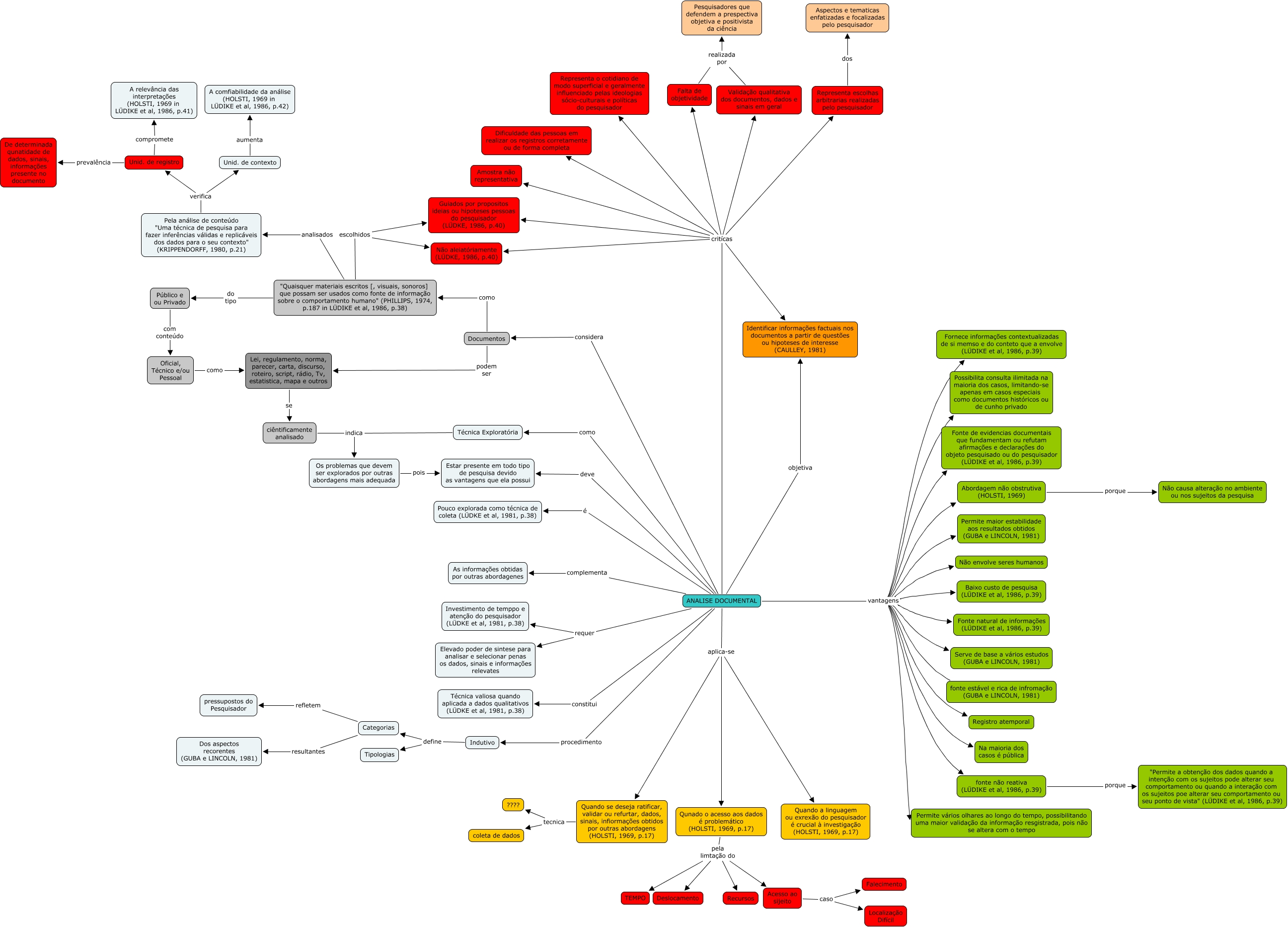Esse mapa conceitual, produzido no IHMC CmapTools, tem a informação relacionada a: ANALISE DOCUEMNTAL, Representa escolhas arbitrarias realizadas pelo pesquisador dos Aspectos e tematicas enfatizadas e focalizadas pelo pesquisador, Lei, regulamento, norma, parecer, carta, discurso, roteiro, script, rádio, Tv, estatistica, mapa e outros se ciêntificamente analisado, "Quaisquer materiais escritos [, visuais, sonoros] que possam ser usados como fonte de informação sobre o comportamento humano" (PHILLIPS, 1974, p.187 in LÜDIKE et al, 1986, p.38) escolhidos Não aleiatóriamente (LÜDKE, 1986, p.40), ANALISE DOCUMENTAL aplica-se Quando se deseja ratificar, validar ou refurtar, dados, sinais, infiormações obtidos por outras abordagens (HOLSTI, 1969, p.17), ANALISE DOCUMENTAL como Técnica Exploratória, "Quaisquer materiais escritos [, visuais, sonoros] que possam ser usados como fonte de informação sobre o comportamento humano" (PHILLIPS, 1974, p.187 in LÜDIKE et al, 1986, p.38) escolhidos Guiados por propositos ideias ou hipoteses pessoas do pesquisador (LÜDKE, 1986, p.40), ANALISE DOCUMENTAL aplica-se Quando a linguagem ou exrexão do pesquisador é crucial à investigação (HOLSTI, 1969, p.17), ANALISE DOCUMENTAL critícas Guiados por propositos ideias ou hipoteses pessoas do pesquisador (LÜDKE, 1986, p.40), ANALISE DOCUMENTAL constitui Técnica valiosa quando aplicada a dados qualitativos (LÜDKE et al, 1981, p.38), Acesso ao sijeito caso Falecimento, Técnica Exploratória indica Os problemas que devem ser explorados por outras abordagens mais adequada, ANALISE DOCUMENTAL requer Elevado poder de sintese para analisar e selecionar penas os dados, sinais e informações relevates, ANALISE DOCUMENTAL critícas Não aleiatóriamente (LÜDKE, 1986, p.40), Unid. de registro compromete A relevância das interpretações (HOLSTI, 1969 in LÜDIKE et al, 1986, p.41), Categorias refletem pressupostos do Pesquisador, ANALISE DOCUMENTAL critícas Identificar informações factuais nos documentos a partir de questões ou hipoteses de interesse (CAULLEY, 1981), Qunado o acesso aos dados é problemático (HOLSTI, 1969, p.17) pela limtação do Acesso ao sijeito, Unid. de registro prevalência De determinada qunatidade de dados, sinais, informações presente no documento, Os problemas que devem ser explorados por outras abordagens mais adequada pois Estar presente em todo tipo de pesquisa devido as vantagens que ela possui, Validação qualitativa dos documentos, dados e sinais em geral realizada por Pesquisadores que defendem a prespectiva objetiva e positivista da ciência