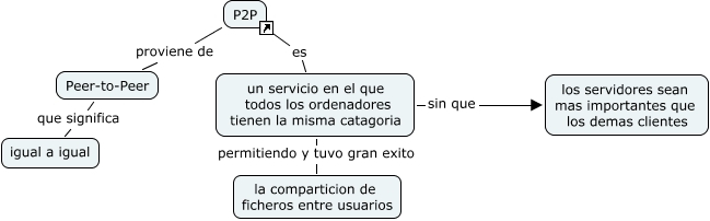 Este Cmap, tiene información relacionada con: P2P, Peer-to-Peer que significa igual a igual, P2P proviene de Peer-to-Peer, P2P es un servicio en el que todos los ordenadores tienen la misma catagoria, un servicio en el que todos los ordenadores tienen la misma catagoria permitiendo y tuvo gran exito la comparticion de ficheros entre usuarios, un servicio en el que todos los ordenadores tienen la misma catagoria sin que los servidores sean mas importantes que los demas clientes