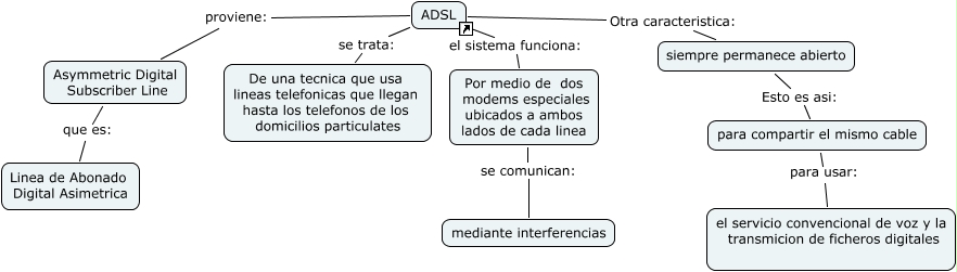 Este Cmap, tiene información relacionada con: ADSL, Asymmetric Digital Subscriber Line que es: Linea de Abonado Digital Asimetrica, para compartir el mismo cable para usar: el servicio convencional de voz y la transmicion de ficheros digitales, siempre permanece abierto Esto es asi: para compartir el mismo cable, ADSL Otra caracteristica: siempre permanece abierto, ADSL proviene: Asymmetric Digital Subscriber Line, ADSL el sistema funciona: Por medio de dos modems especiales ubicados a ambos lados de cada linea, ADSL se trata: De una tecnica que usa lineas telefonicas que llegan hasta los telefonos de los domicilios particulates, Por medio de dos modems especiales ubicados a ambos lados de cada linea se comunican: mediante interferencias